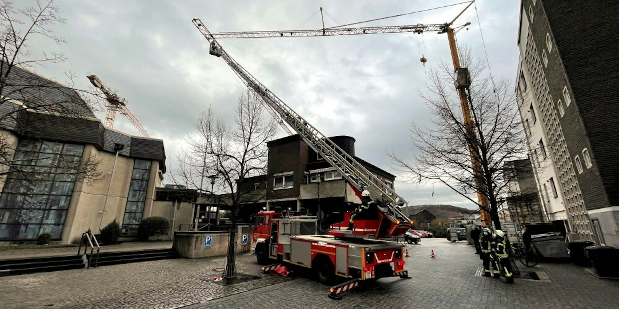 Derweil positionierten die hauptamtlichen Kräfte der Gummersbacher Wache ihren Drehleiterwagen auf den Parkbuchten vor dem Pfarrbüro – erst vorwärts. Doch so war die Drehleiter nicht lang genug, um die Kranausleger zu erreichen. Also rangierte der Drehleiterwagen rückwärts ein, und so konnte ein Feuerwehrmann im Korb des Leiterwagens schließlich mit einem beherzten Hieb die Ausleger voneinander lösen.