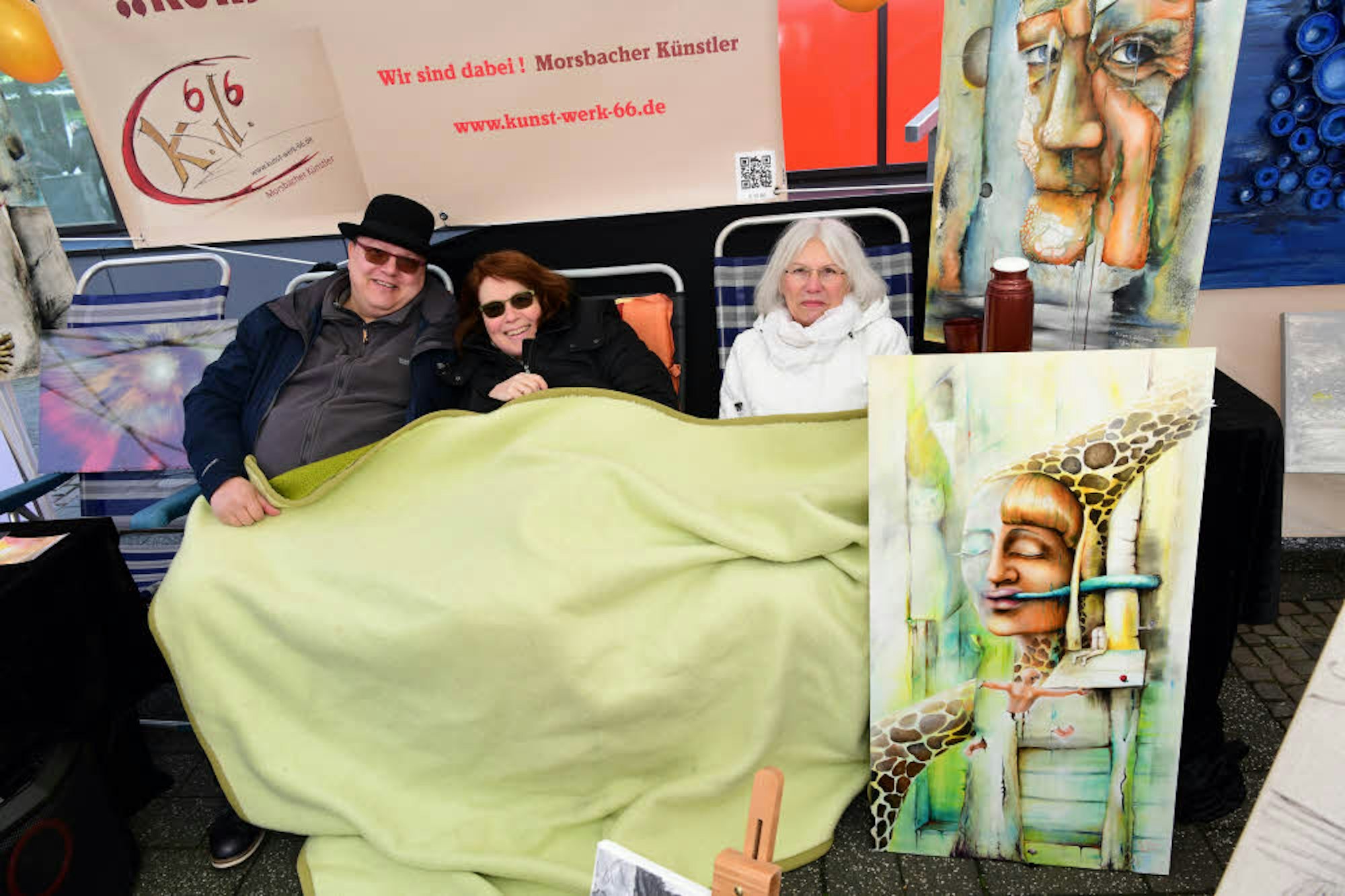 Dicke Jacken oder Decken hatten die Künstler dabei, die ihre Werke in der kühlen Innenstadt ausstellten.