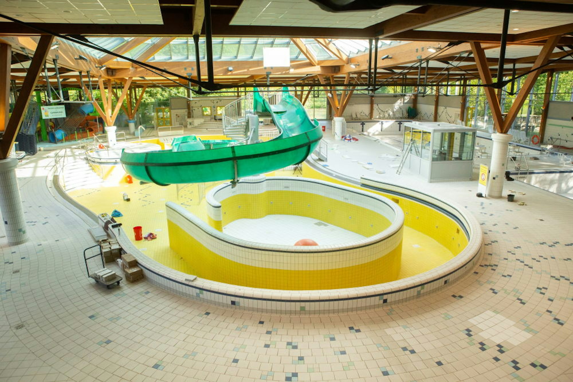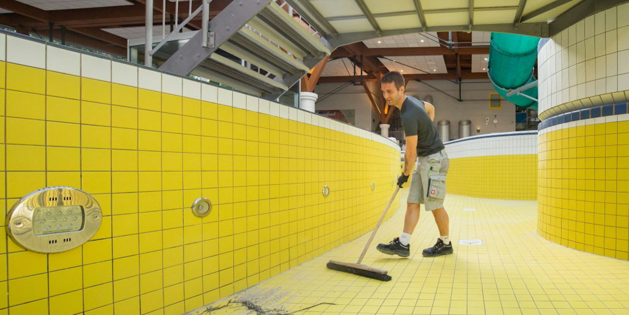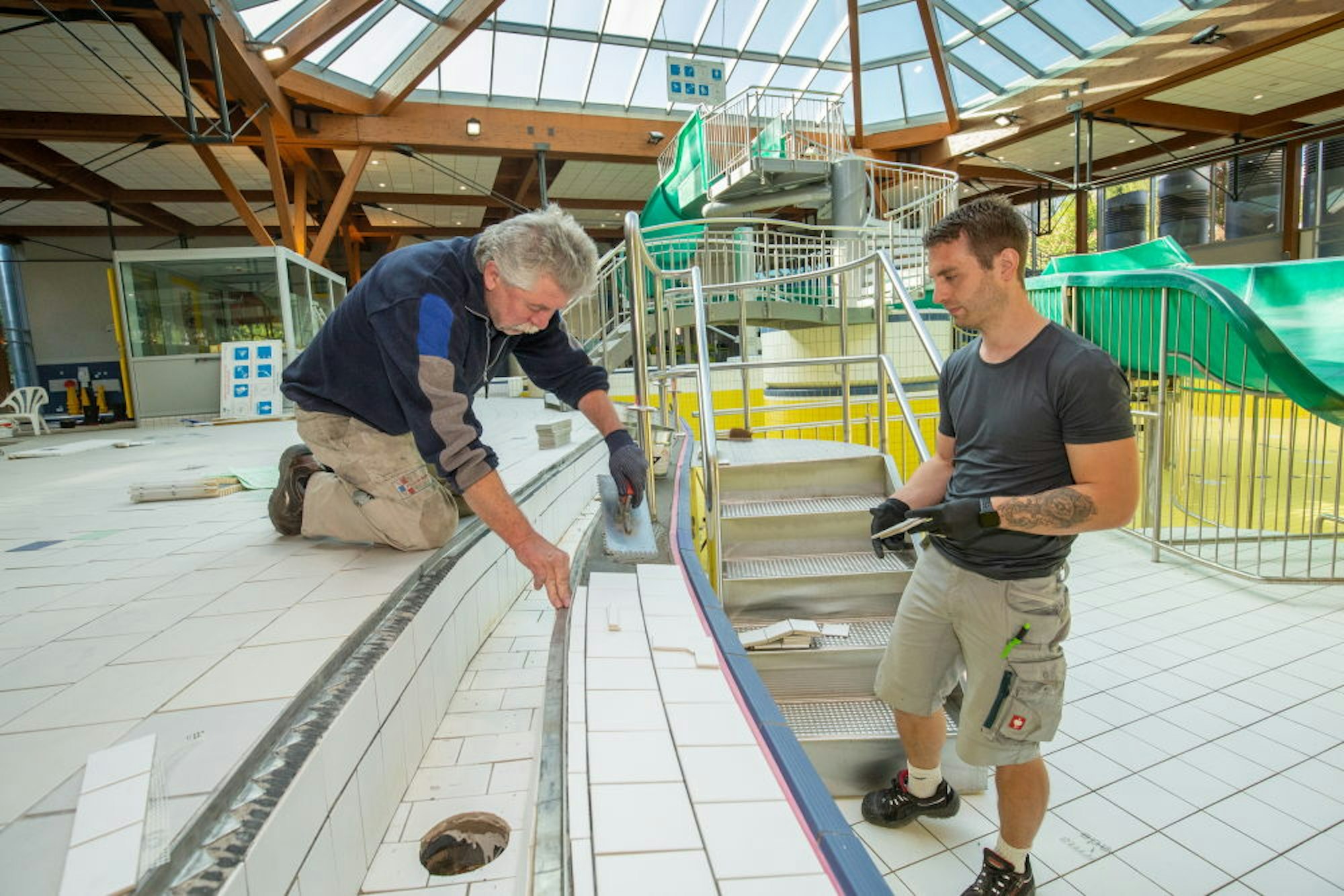 Gummersbach – Zur Zeit räkeln sich nur die Kanadagänse am Strand des Naturfreibads Bruch. Und wer im Gumbala die Rutsche runtersausen würde, würde geradewegs auf den Köpfen der Fliesenleger landen, die auf dem Grund des Beckens bei der Arbeit sind. Beide Gummersbacher Bäder werden im Rahmen der zweijährigen Revision fit gemacht.