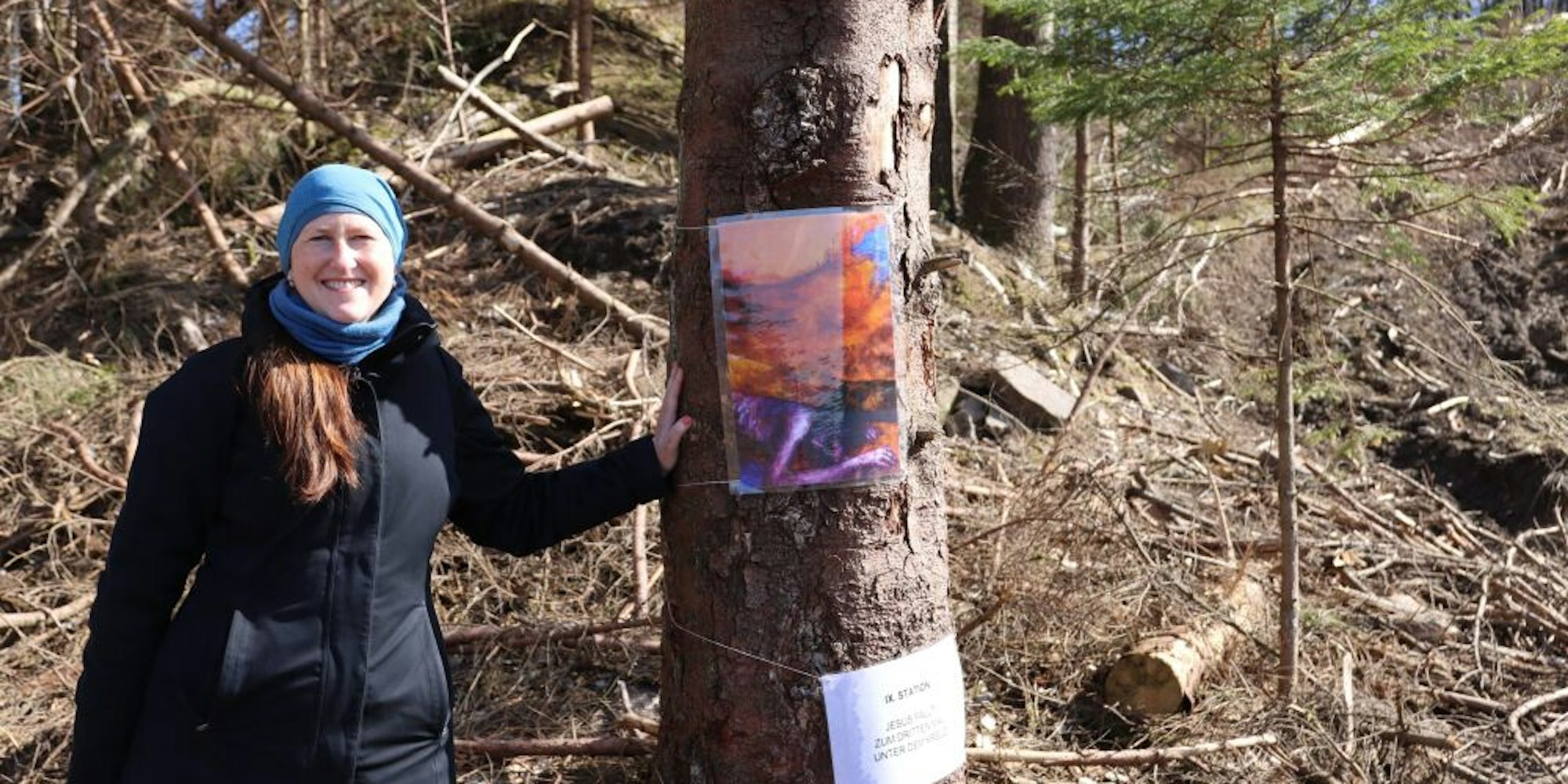 Alexandra Pook Pfarrerin der evangelischen Gemeinde Hülsenbusch-Kotthausen, hat den „Kreuzweg im Wald“ an und zwischen Baumstämmen installiert.