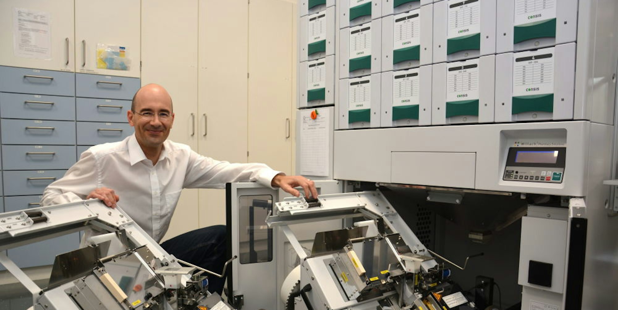 Der Verblisterungsautomat der Ruppichterother Firma Willach versorgt alle stationären Patienten. Geschäftsführer Jens Willach führt die austauschbare Verpackungseinheit vor.