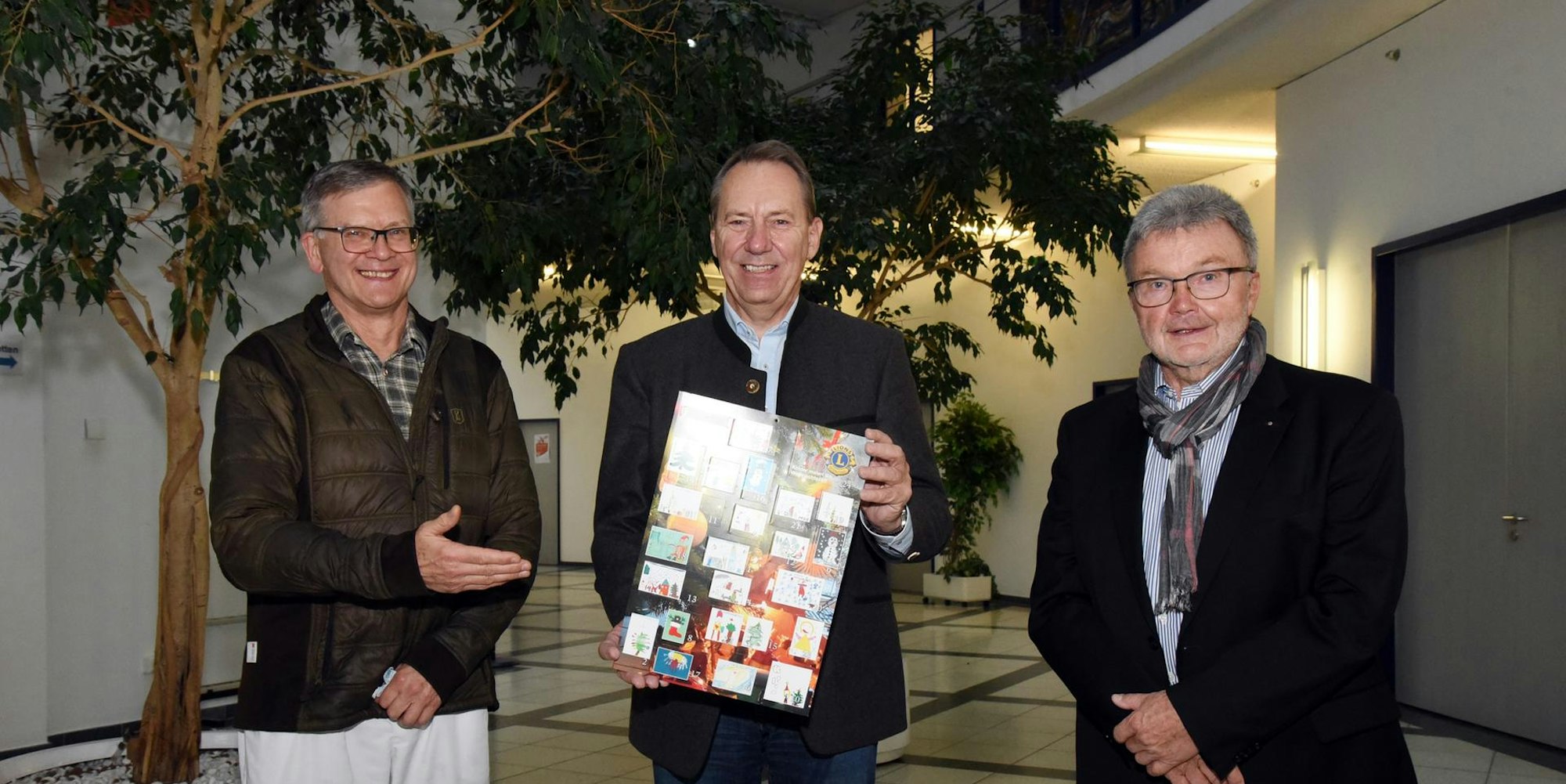 Den ersten Lionsclub-Adventskalender kaufte Landrat Jochen Hagt (M.) Dr. Heinz-Dieter Borchers (r.) und Dr. Christian Rogos ab.