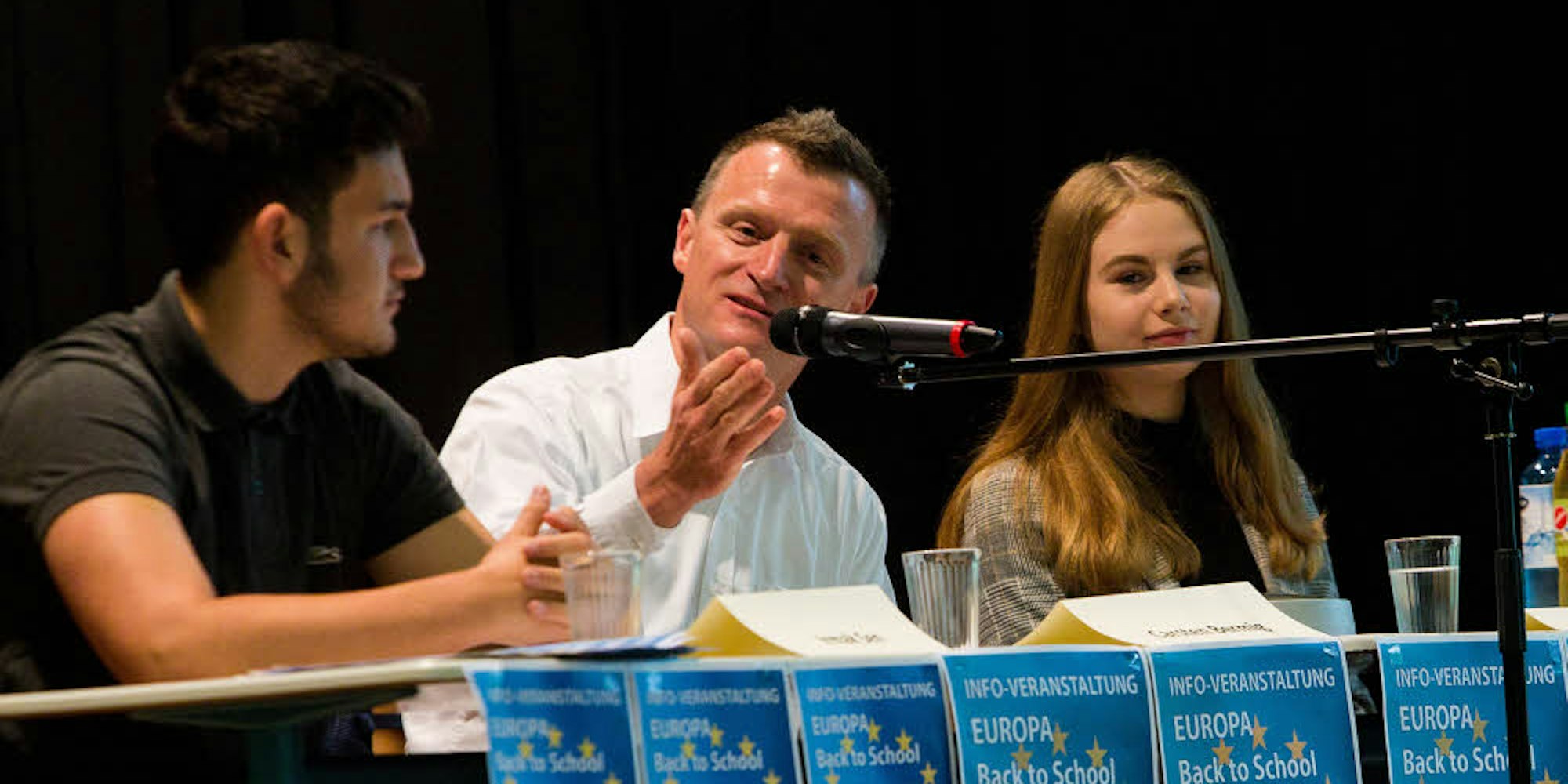 Carsten Bermig (48), gebürtiger Gummersbacher und Mitarbeiter der Europäischen Kommission, stand Schülerinnen und Schülern des Lindengymnasiums in Gummersbach Rede und Antwort. Es moderieren Irmak Sen (l.) und Verena Bodendorfer.