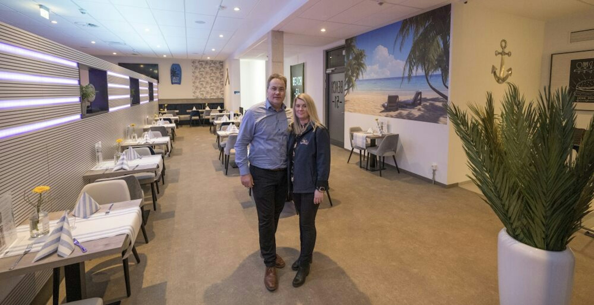 Gummersbach – Draußen Schmuddelwetter und drinnen ein Hauch von Strandatmosphäre. Gibt’s nicht? „Gibt’s doch“, sagt der Gummersbacher Brauhaus-Chef Andreas Linneboden, der am Dienstag mit seinem „Beach 51“ in der Halle 51 auf dem Steinmüllergelände offiziell an den Start geht. Und das zusammen mit Lebensgefährtin Christina Oldenburger, die unter anderem gelernte Köchin ist.