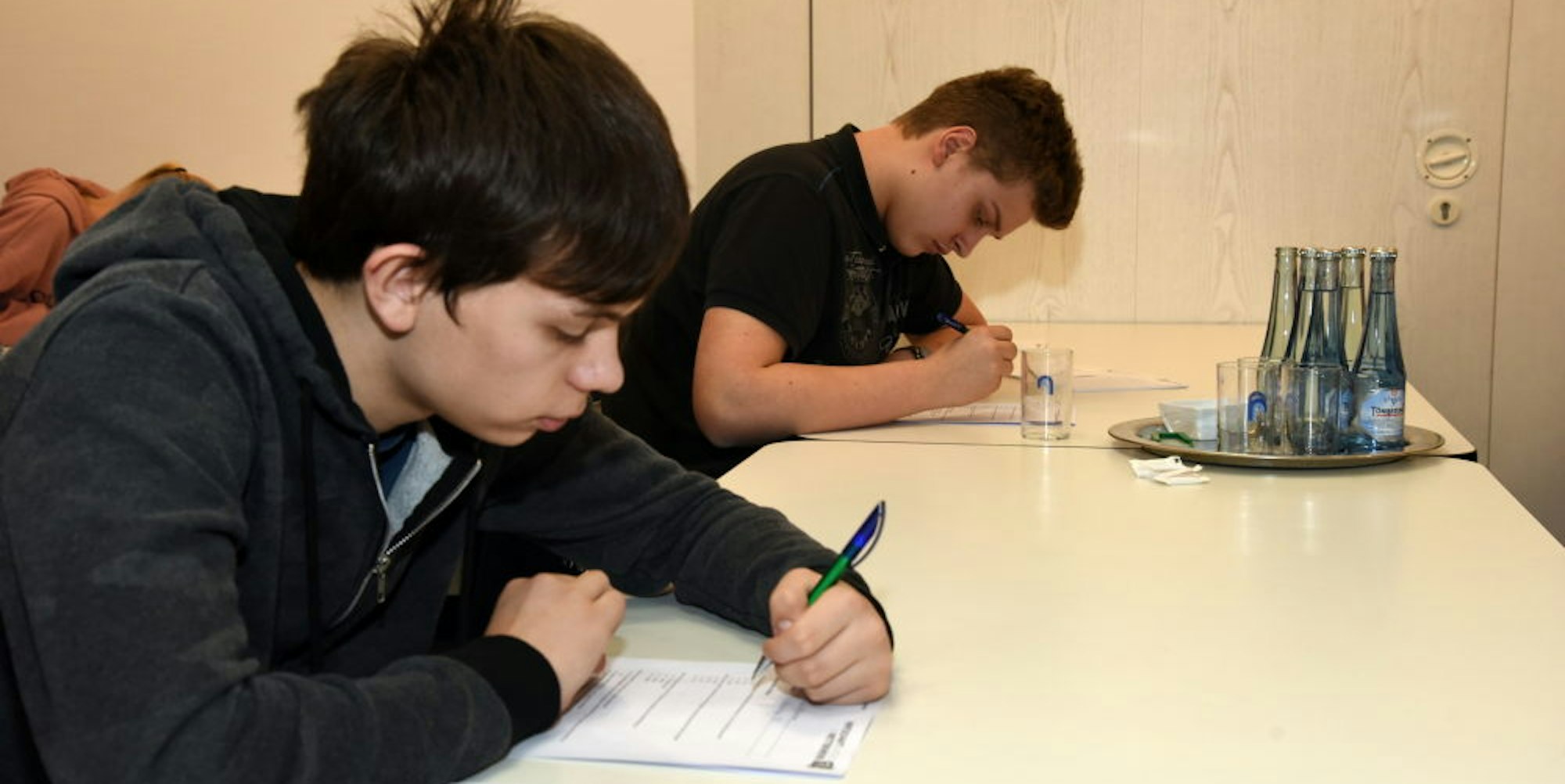 Jetzt galt es, in den Räumen der Aggerenergie „Oberbergs schlausten Schüler oder Schülerin“ zu küren, wie Michel Zacher, Kreissprecher der Wirtschaftsjunioren Oberberg, scherzhaft ankündigte. Mourice und Jonathan vom Wiehler Dietrich-Bonhoeffer- Gymnasium sahen dem Test in Form eines Fragebogens ganz gelassen entgegen: „Mein Lieblingsfach ist Politik, und das ist gleichzeitig auch mein Hobby“, erklärte der 15-jährige Mourice, der später selbst „in die Politik gehen“ möchte. Sein Schulkollege Jonathan erzählte, dass er täglich Nachrichten im Radio höre und sich gern über aktuelle Themen informiere. „Aber dabeisein ist alles!“