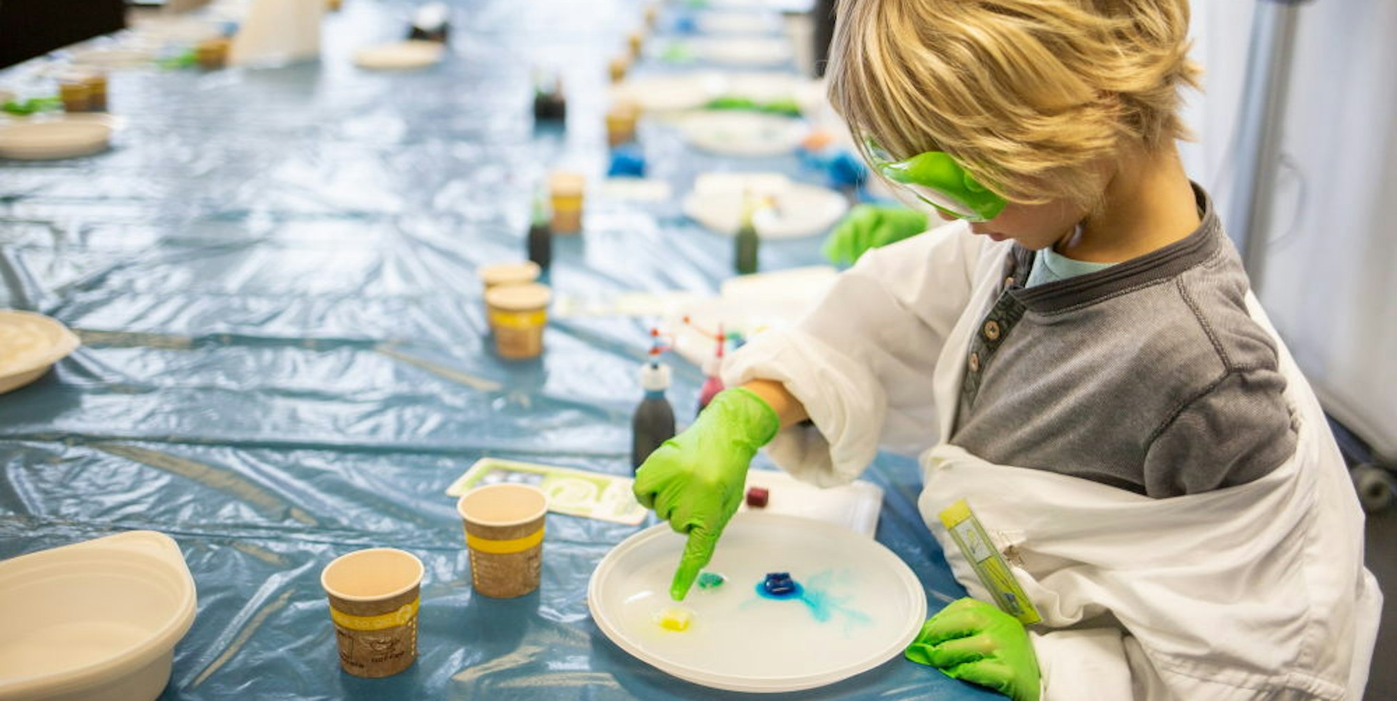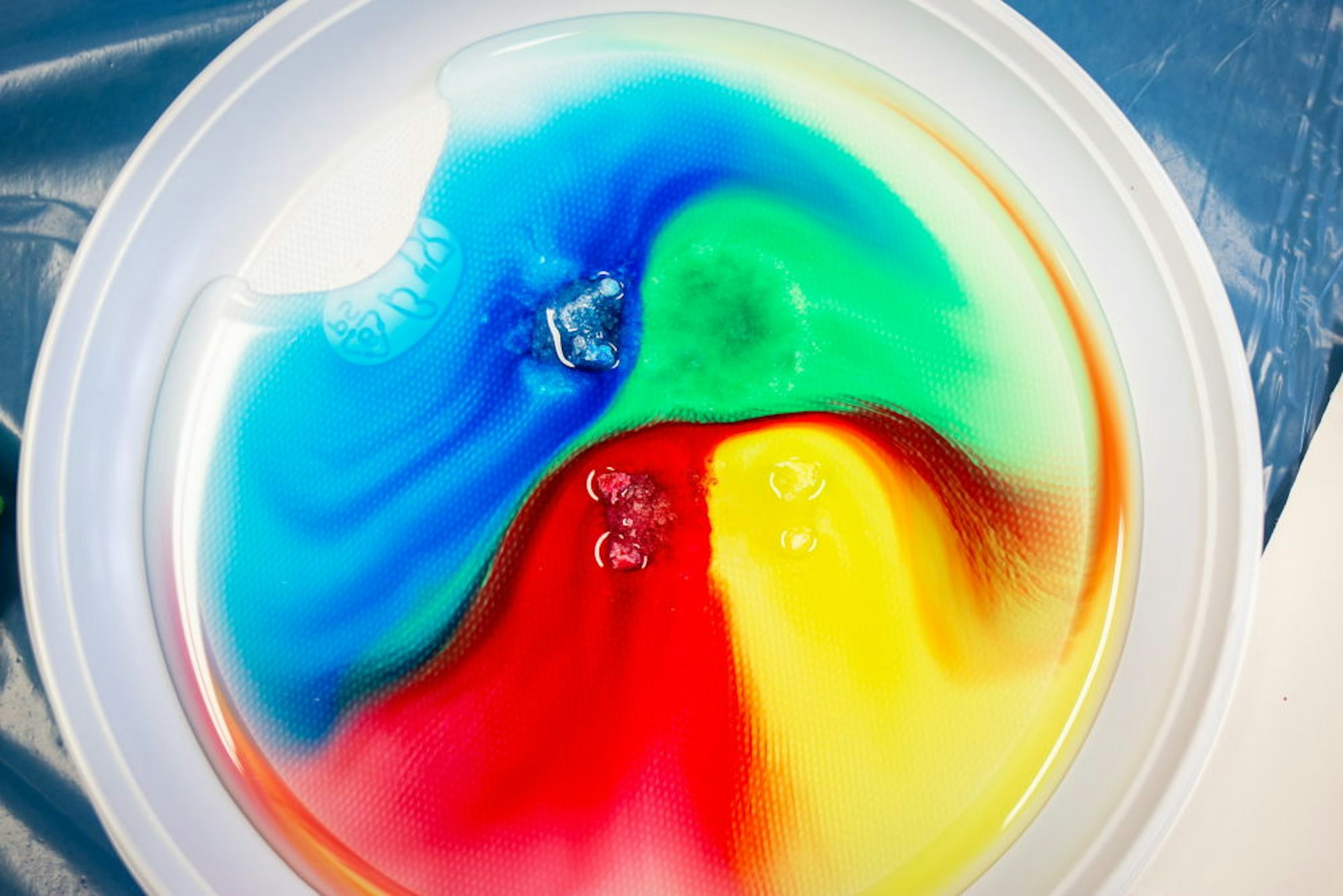 Warum mit Farbe beträufelte Zuckerwürfel sich im Wasser auflösen und dabei bunte Bilder entstehen, lernen die Kinder beim Experiment „Zuckerbilder“.