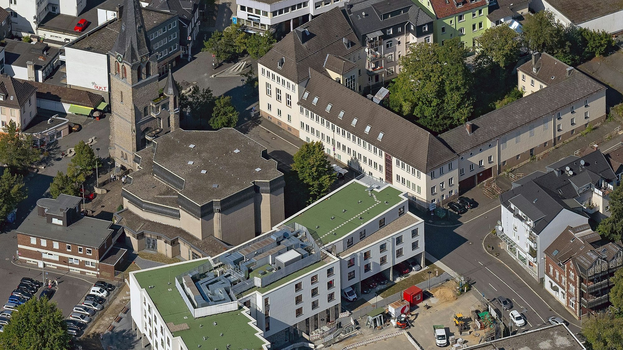 In direkter Nachbarschaft von katholischer Kirche und dem neuen Altenheim liegt das ehemalige Gummersbacher Amtsgericht. Auf dem Areal sollen Wohnungen neu gebaut werden.