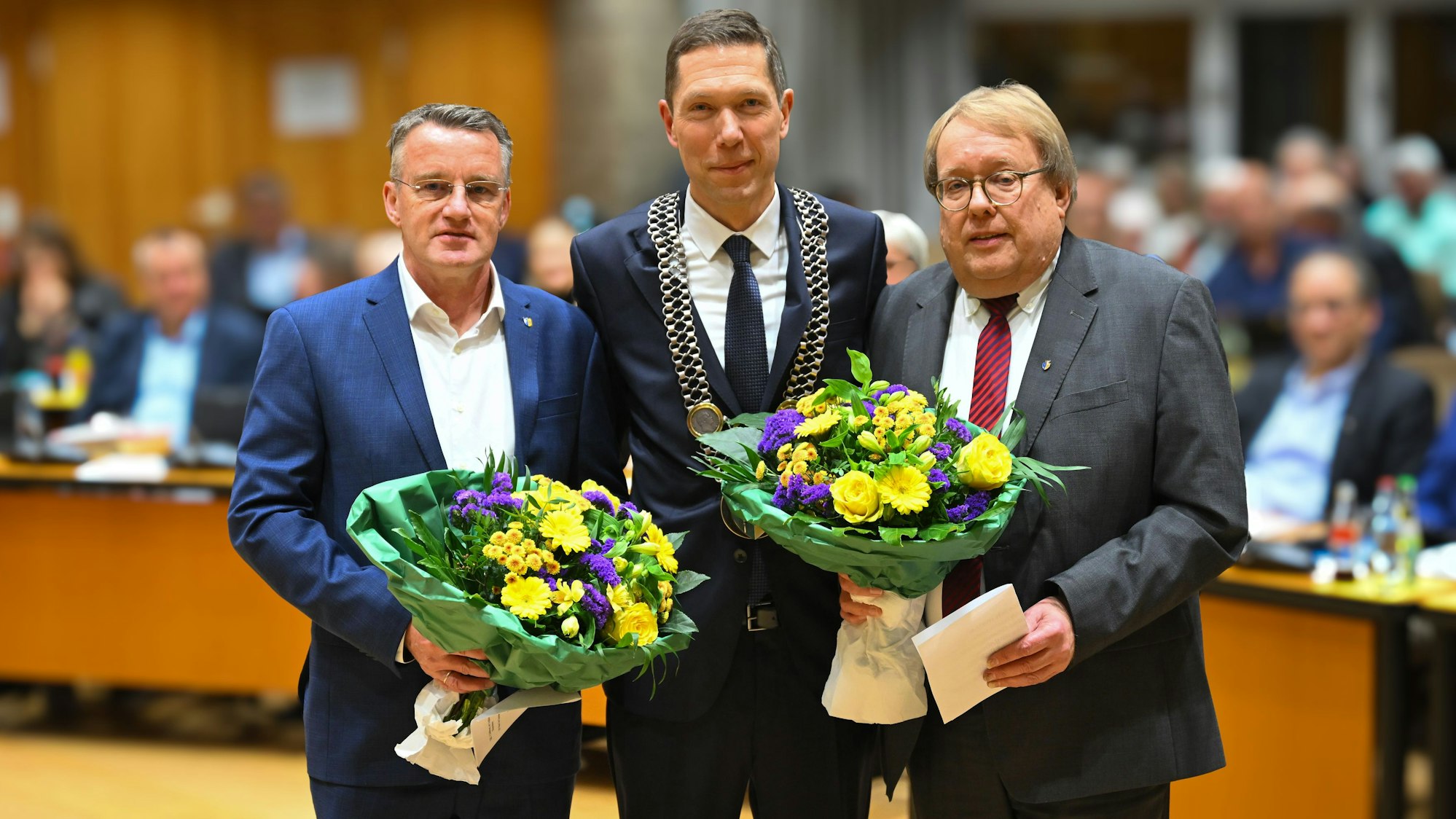 Raoul Halding-Hoppenheit (M.) bei seiner ersten Ratssitzung mit seinen Stellvertretern Jürgen Marquardt (1./r.) und Oliver Kolken (2.)