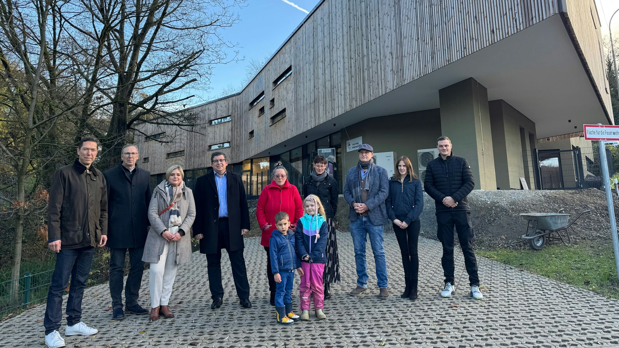 Bereits seit August dieses Jahres ertönt in der neuen Awo-Kita „Frieda Nadig“ im Gummersbacher Stadtteil Hülsenbusch lautes Kinderlachen. Im Beisein von Bürgermeister Frank Helmenstein, dem Ersten Beigeordneten Raoul Halding-Hoppenheit, dem Technischen Beigeordneten Jürgen Hefner sowie Volker Müller, Geschäftsführer der Gummersbacher Wohnungsbaugesellschaft (GWG) sowie Vertretern des Awo-Kreisverbandes Rhein-Oberberg wurde das Gebäude nun auch offiziell eingeweiht.