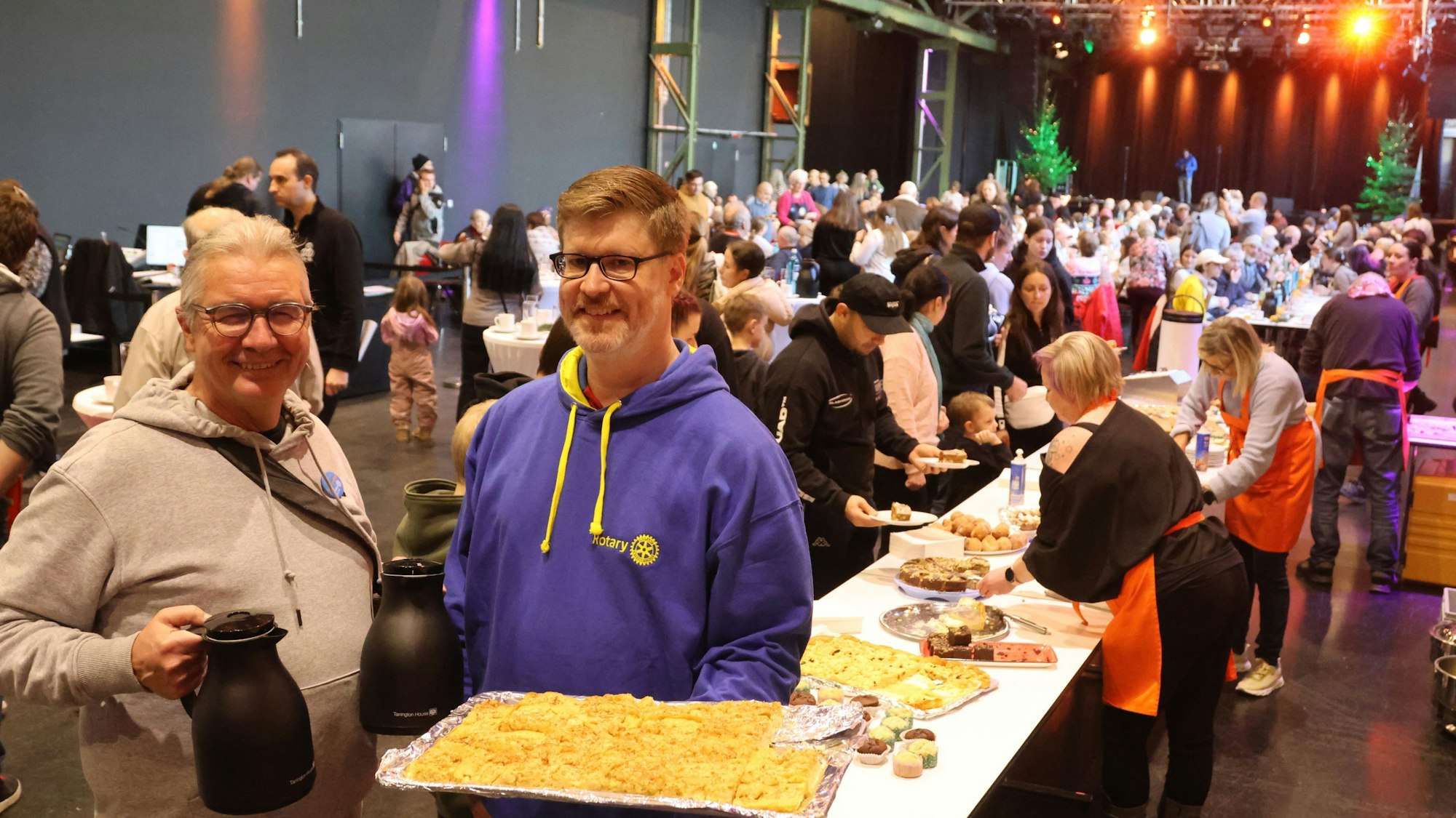Bereits zum dritten Mal veranstalten die beiden Rotary-Clubs Gummersbach und Gummersbach-Oberberg gemeinsam mit dem Inner Wheel Club und der Tafel Oberberg die Weihnachtstafel für bedürftige Menschen aus der Region. Und das findet, wie auch in den Jahren zuvor, großen Anklang – etwa 670 bedürftige Menschen, darunter 280 Kinder, strömen zur Mittagszeit in die Halle 32 und lassen sich von dem 80-köpfigen Helferteam kulinarisch verwöhnen. Es gibt frische Waffeln, verschiedene Kuchen und Muffins und zur späteren Stunde noch eine warme Mahlzeit, bei der zwischen Gulasch- und Kürbissuppe gewählt werden kann. Um den zahlreichen Besucherinnen und Besuchern neben den Köstlichkeiten einen unvergesslichen Nachmittag zu bereiten, haben die Organisatoren ein buntes Rahmenprogramm auf die Beine gestellt.