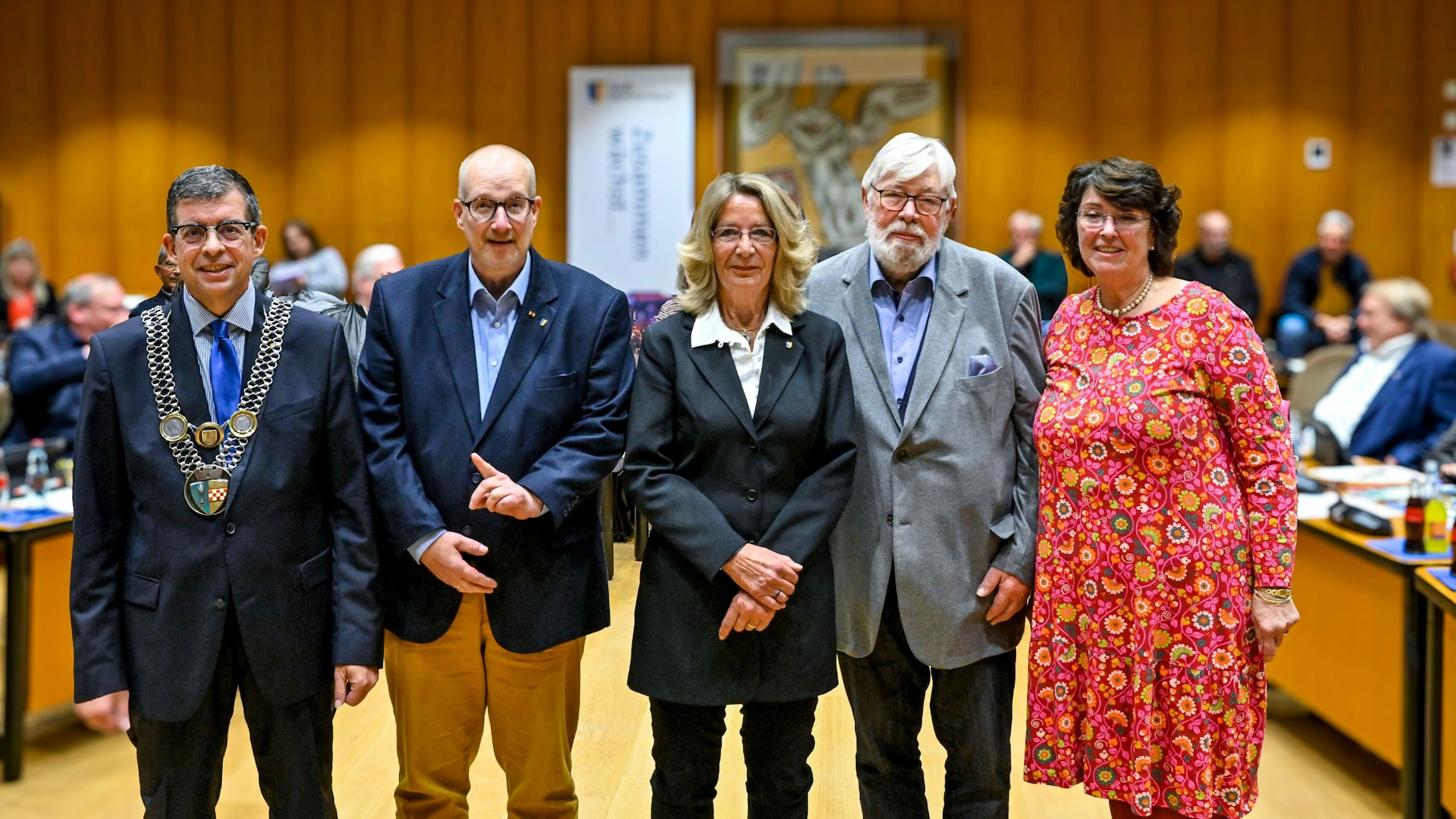 Bürgermeister Frank Helmenstein mit (v.l.) Joachim Tump, Helga Auerswald, Karl-Otto Schiwek und Bärbel Frackenpohl-Hunscher.