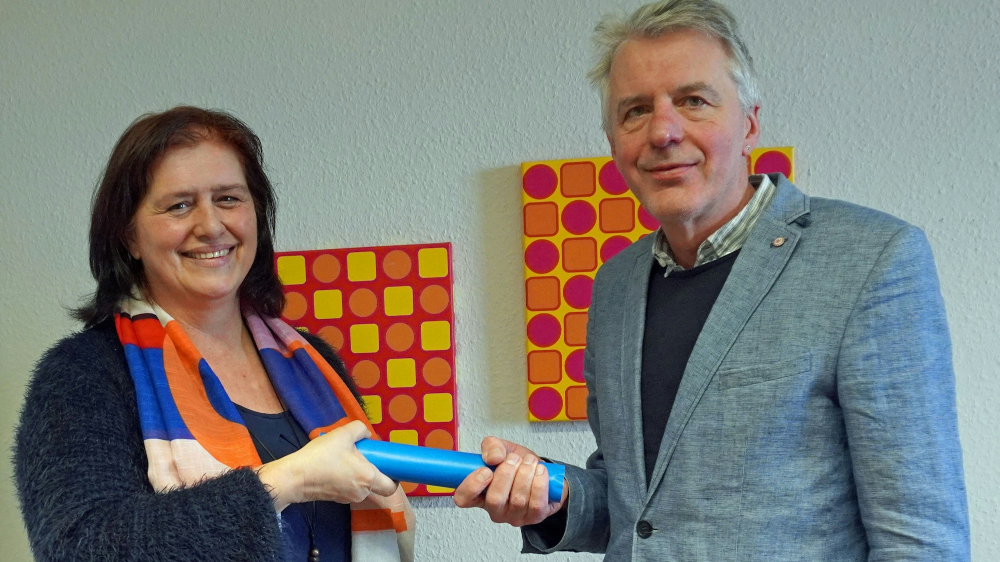 Den symbolischen Staffelstab tauschte Marianne Haupt zum Amtsantritt mit ihrem Vorgänger Bernd Christ, der nun ihr Stellvertreter ist.
