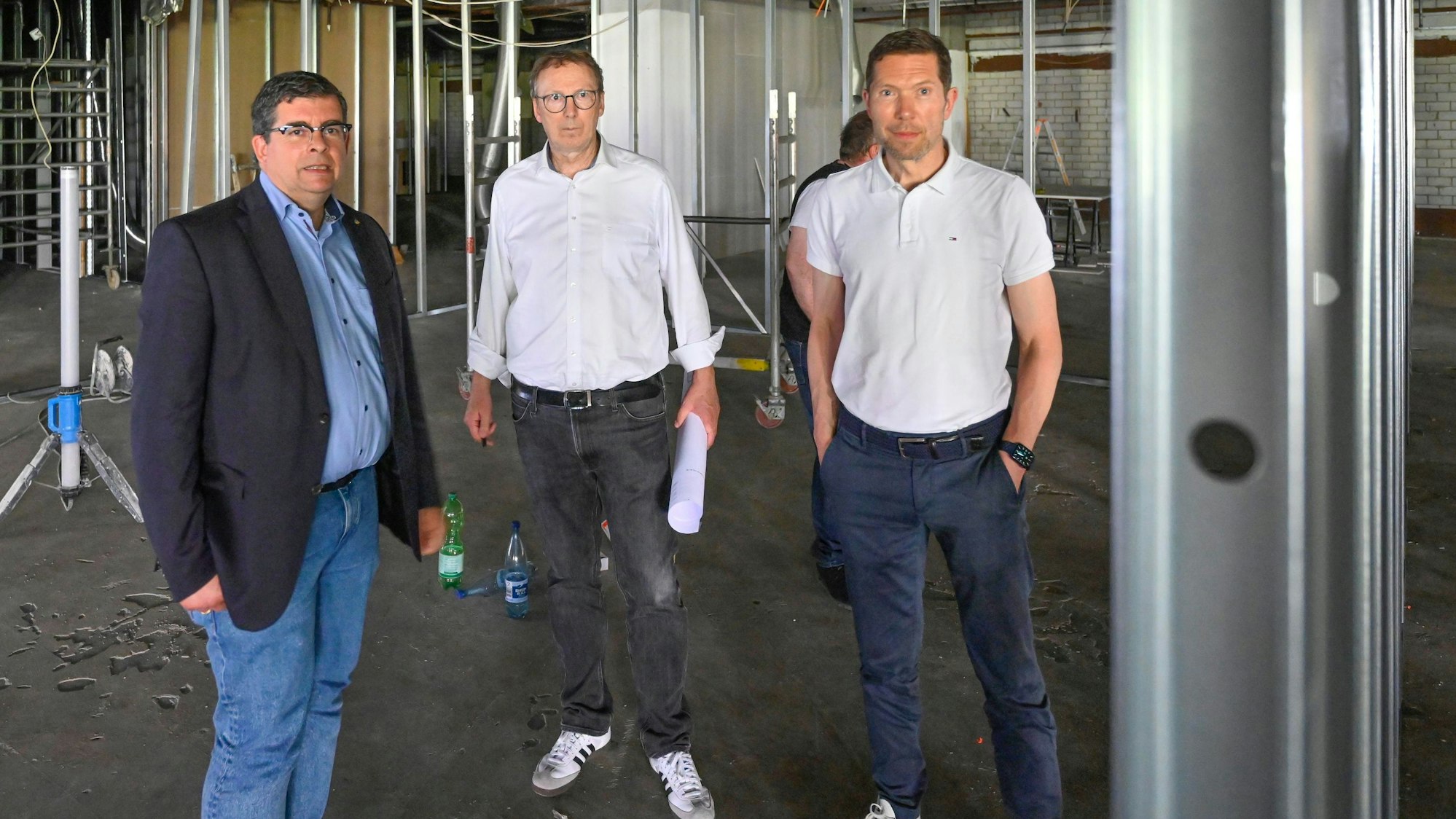 Frank Helmenstein (l.) mit seinen Beigeordnetenkollegen auf der Baustelle der Bücherei, die bald seinen Namen tragen soll.
