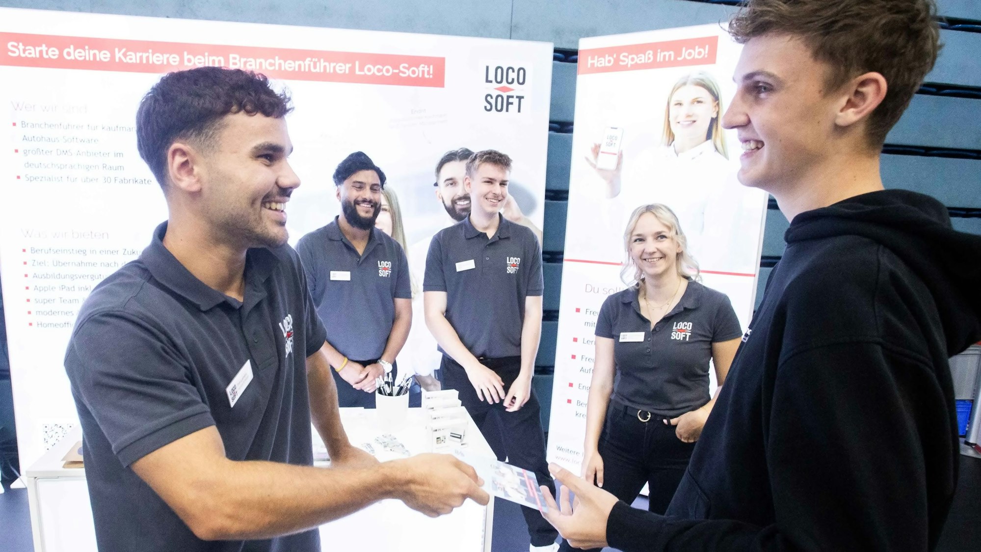 Während viele Unternehmen mit einem dualen Studium locken, tickt man bei Elektrisola ein wenig anders. „Wir sagen ‚mach erst mal eine Ausbildung und teste aus, was Dein Ding ist‘,“ erklärt Saggiono. Im Anschluss sei es dann möglich auf eine Teilzeitstelle zu gehen und nebenbei zu studieren. Ein paar Meter weiter hat Loco Soft seinen Stand aufgebaut. Das Lindlarer Unternehmen mit rund 100 beschäftigten entwickelt und vertreibt spezielle Software für Autohäuser. Tim Lamers (21) lässt sich dort zum IT-Systemmanager ausbilden. Nebenbei studiert es an einer Fernuni noch Wirtschaftspsychologie, an drei Abenden in den Woche. Das Studium bezahlt sein Arbeitgeber.