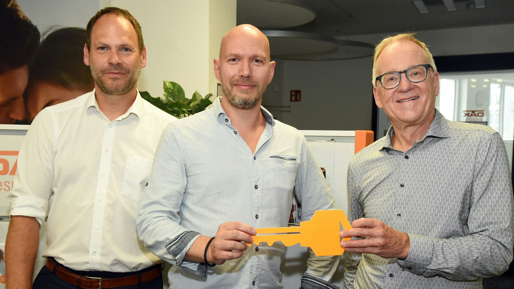 Den symbolischen Schlüssel übergab Wolfgang Brelöhr (r.) in Anwesenheit von Frank Jakobs (l.) an seinen Nachfolger Jörg Müller.