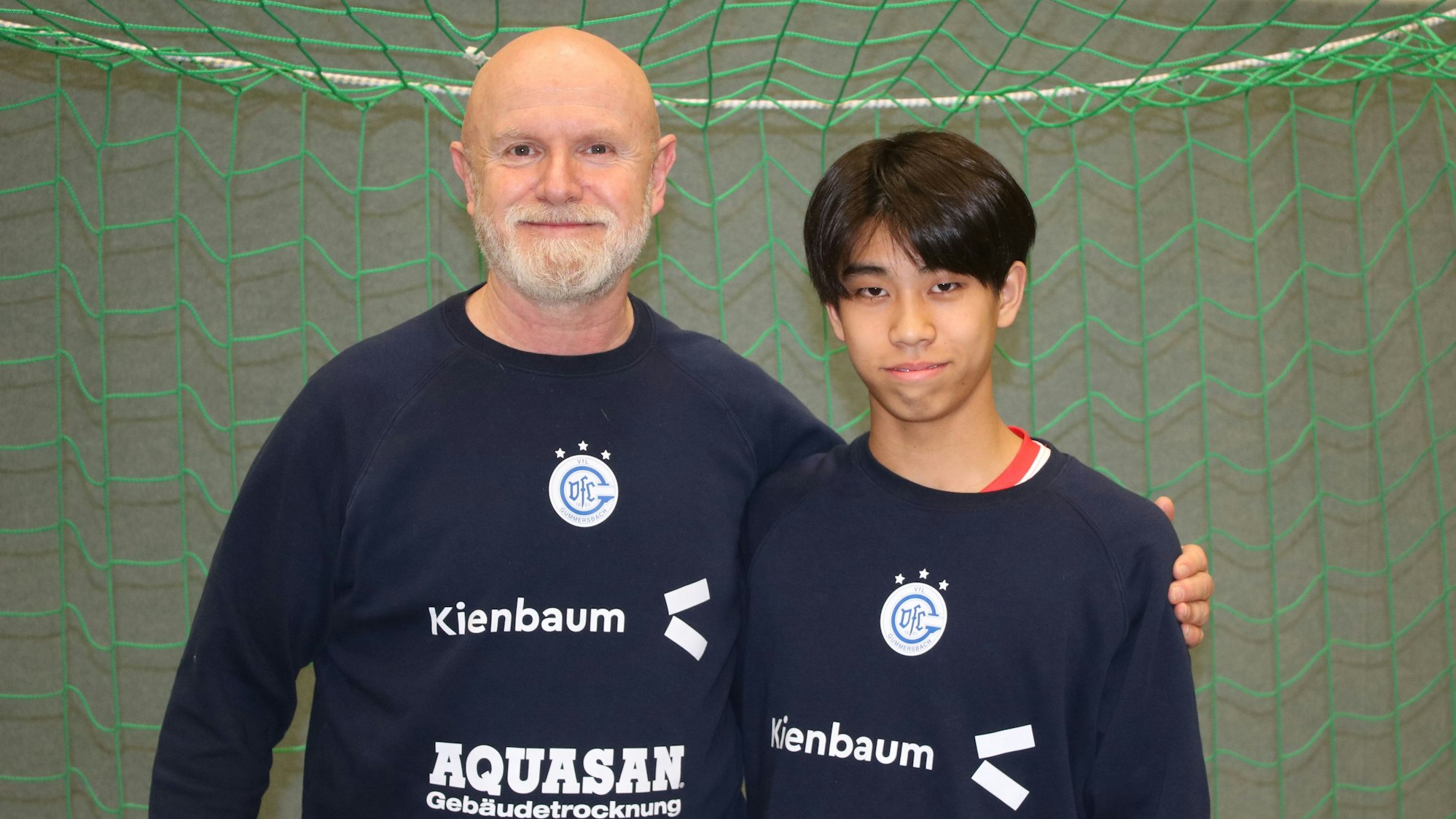 VfL-Handballakademie: Leiter Jörg Bohrmann mit Spieler Gen Arima.
