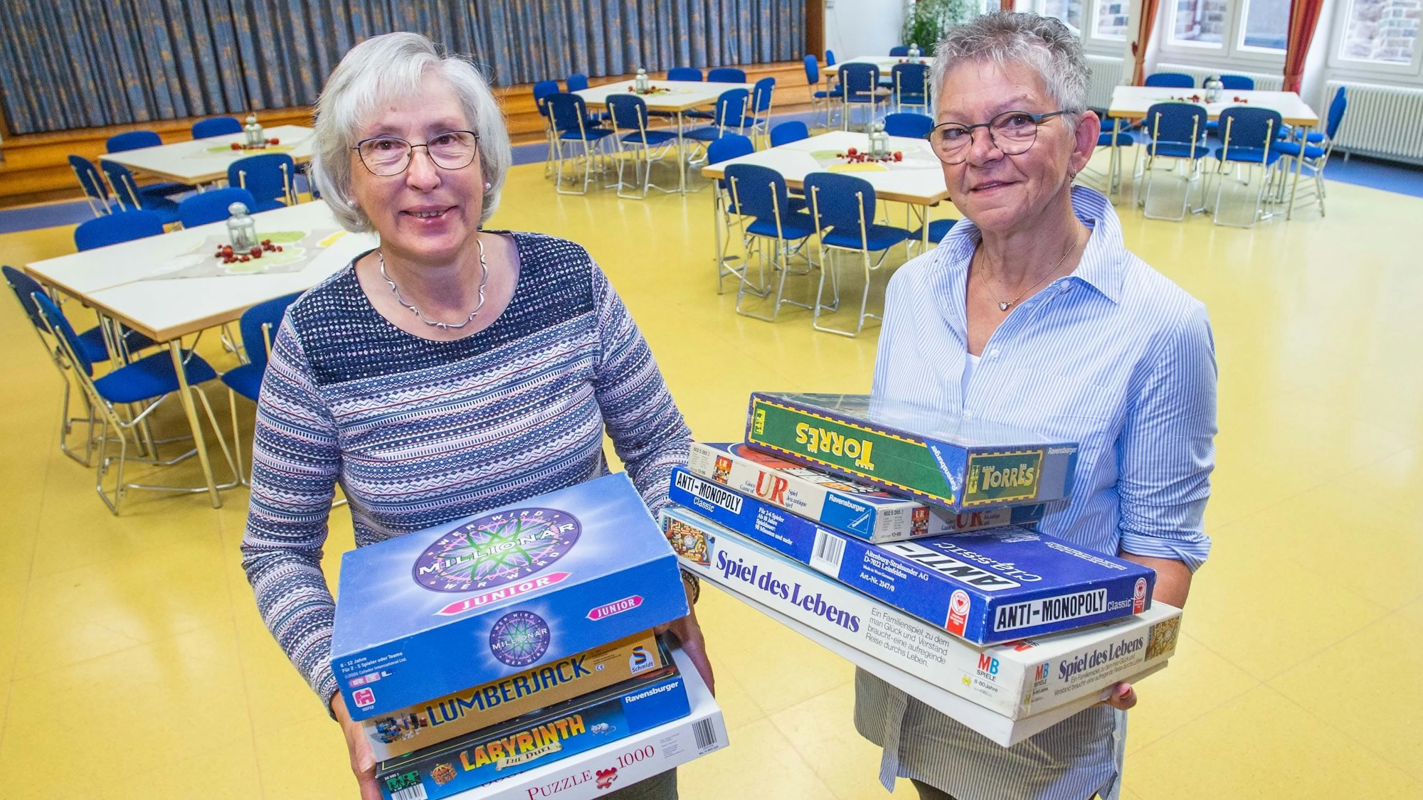 Renate Meißner (l.) und Anne Schürholz vom vierköpfigen Organisationsteam bereiten in Dieringhausen den Jubiläums-Basar vor.