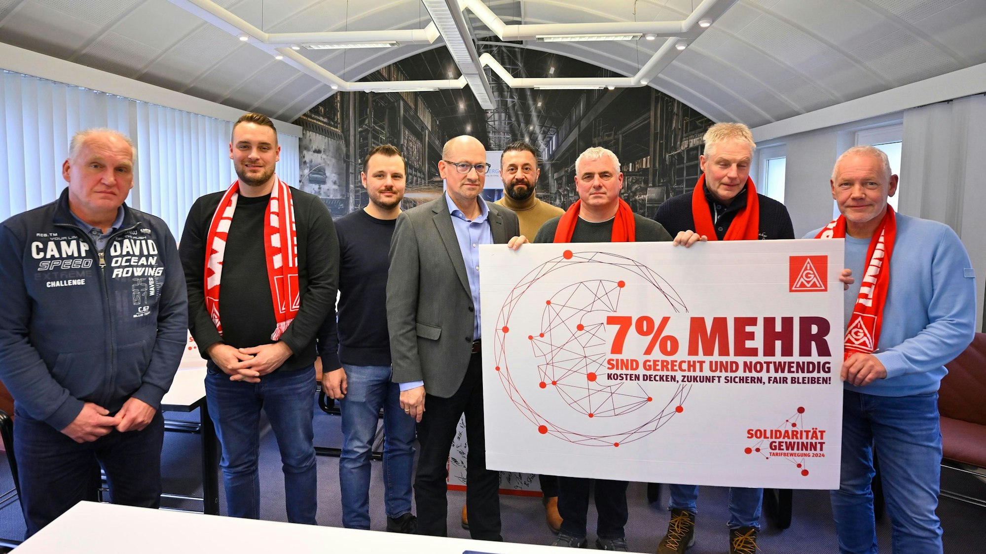 Der Ortsvorstand der IG Metall Gummersbach überreichte Ulrich Koch (4.v.l.) eine überdimensionale Postkarte mit Forderungen.