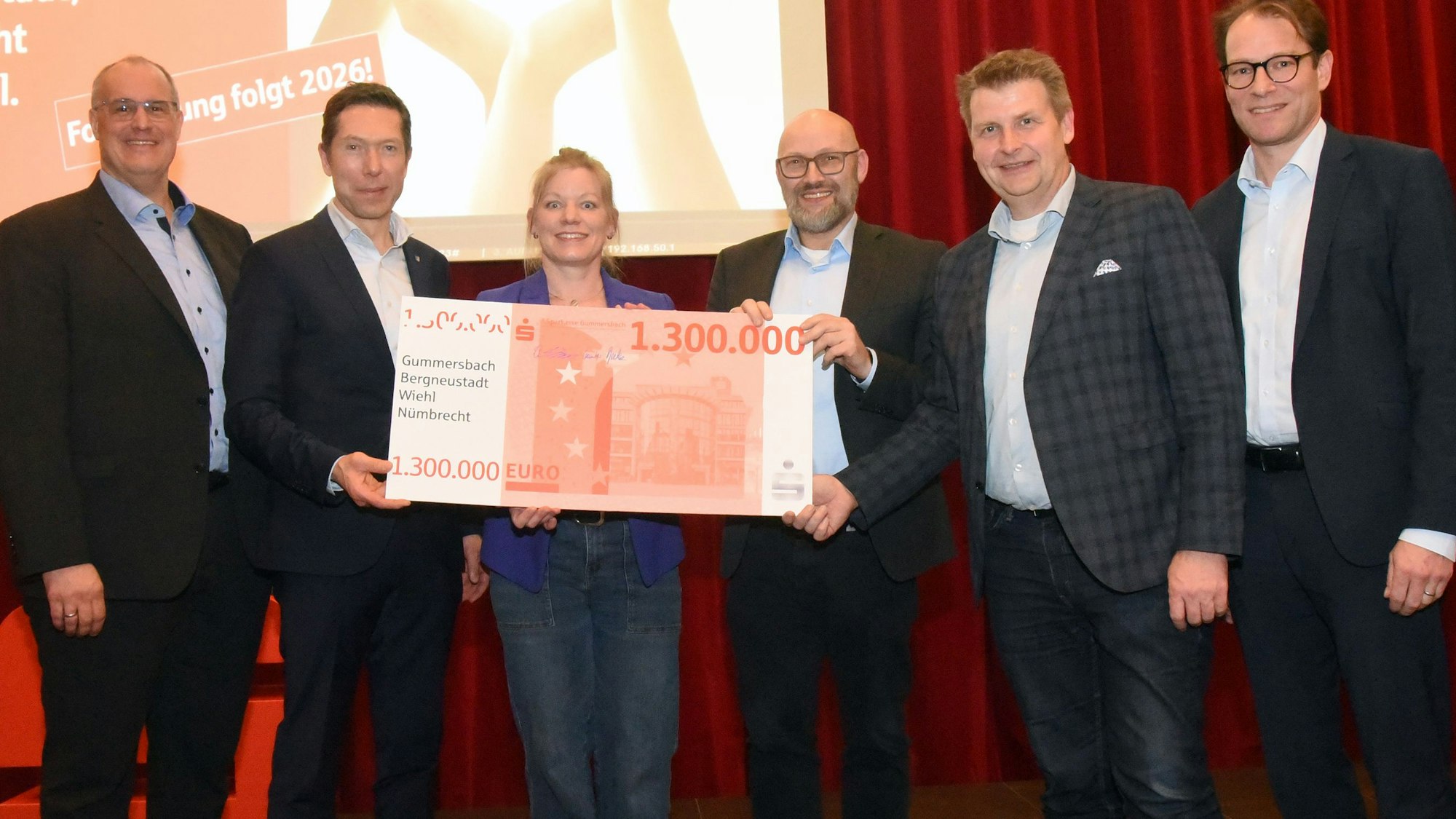 Eine stolze Summe: Den symbolischen Scheck präsentierten Sparkassenchef Dirk Steinbach (l.) und Vorstandsmitglied Gunter Derksen (r.) zusammen mit (v.l.) Gummersbachs Bürgermeister Raoul Halding-Hoppenheit, Julia Schalles (Stadt Bergneustadt), Nümbrechts Bürgermeister Thomas Hellbusch und Peter Madel (Stadt Wiehl).