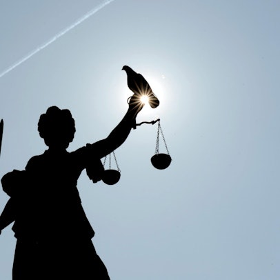 Eine Taube sitzt auf einer Justitia (Symbolbild)