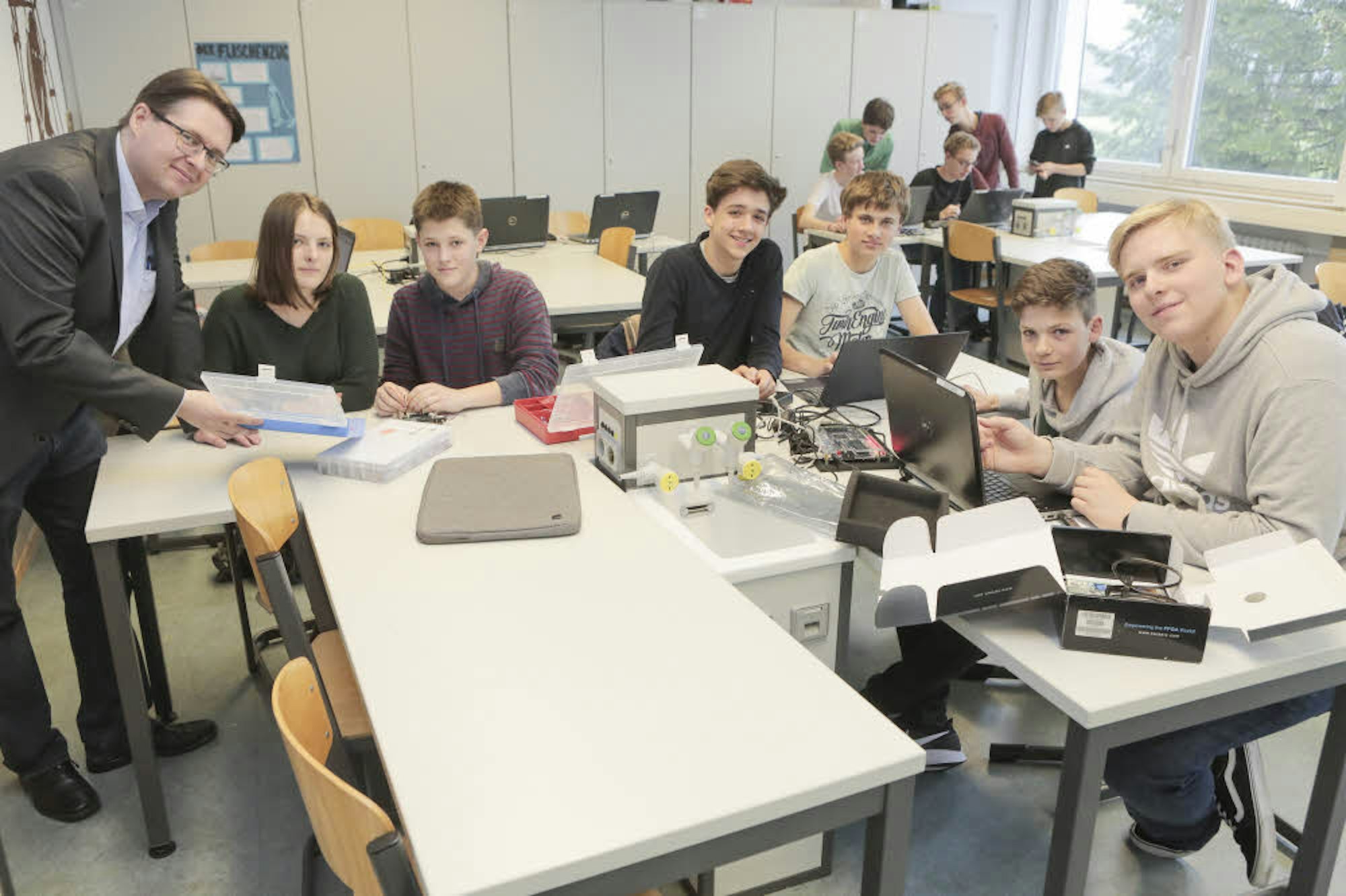 In der Mint-AG des Gymnasiums arbeiten die Schüler, unterstützt von Lehrer Thomas Hillebrand (l.) weiter an ihren Projekten.