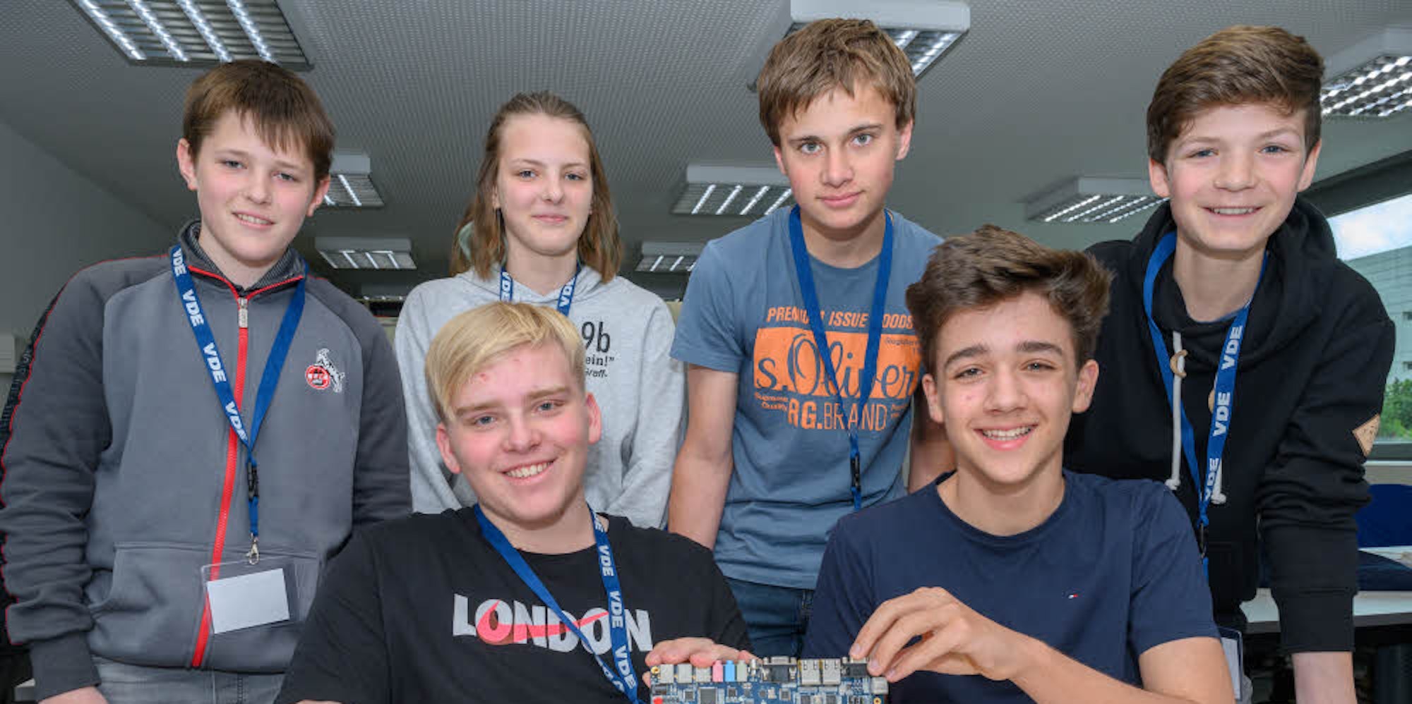 Die erfolgreichen zwei Schülerteams des Gymnasiums Lindlar mit einem selbst programmierten Chip. Auf dem Foto (v.l.): Tom, Justus, Connor, Tara, Andreas und Fabian.