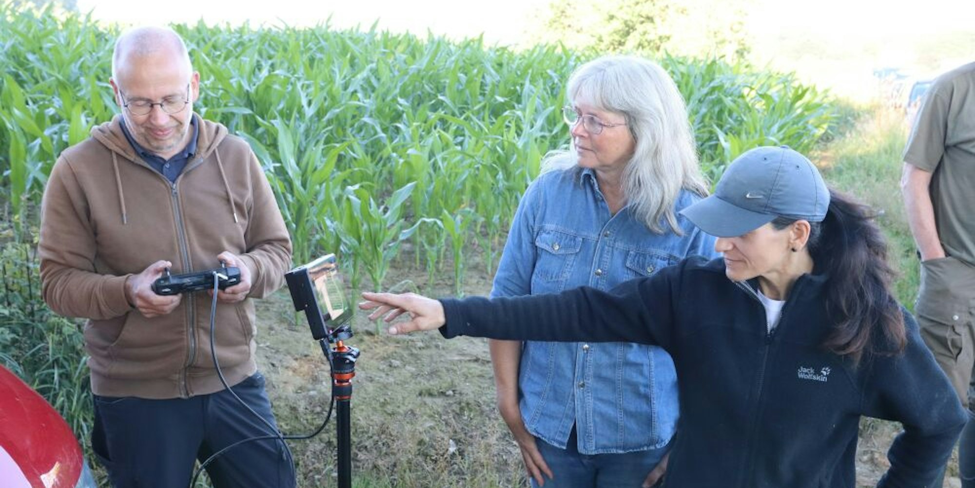 Markus Pieper steuert die Drohne, Elke Eisbach und Lucia De Giovanni haben auf dem Monitor ein Tier entdeckt. Wenn sie nicht selbst wegspringen, werden die Jungtiere vorsichtig vor dem Mähdrescher in Sicherheit gebracht.