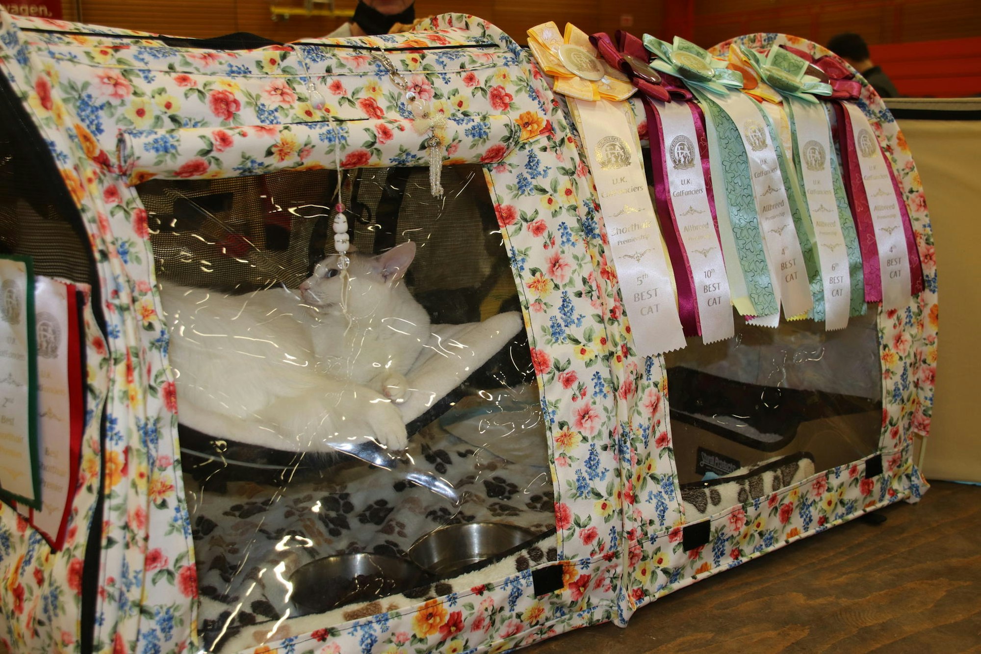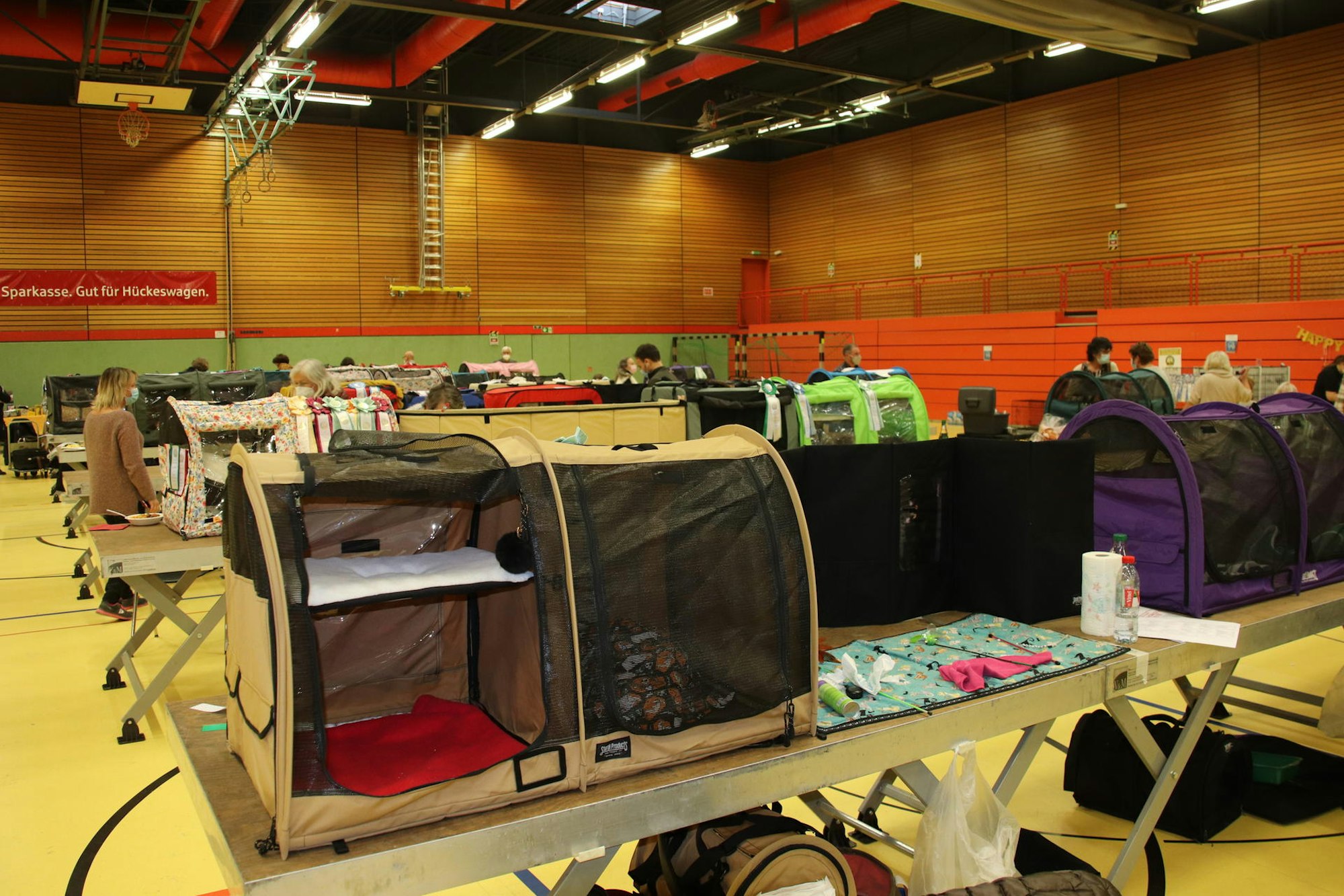 So richtig vornehm sieht auf den ersten Blick in der Halle gar nichts aus. Ein großer Raum mit vielen Tischen, auf denen aufgereiht faltbare Transportboxen stehen. Wer aber einen Blick hineinwirft, kann ganz unterschiedliche Rassekatzen bestaunen, die darin friedlich schlummern oder neugierig beobachten. Sie haben glänzendes Fell, beinahe schöner als die Damen, die man in der Shampoowerbung im Fernsehen sieht.