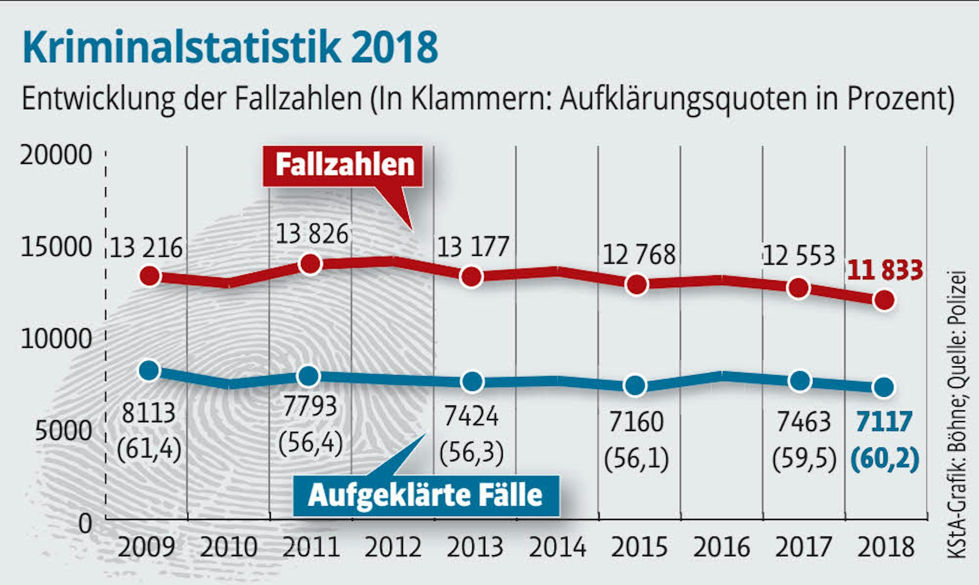 Doch nicht nur bei den Wohnungseinbrüchen sind die Fallzahlen im Oberbergischen deutlich zurückgegangen. Insgesamt sank die Zahl der 2018 von der Polizei bearbeiteten Fälle um gut 5,7 Prozent auf 11 833. Ein Tiefstwert: Weniger Fälle wurden von der Kreispolizei zuletzt im Jahr 2000 bearbeitet. Zugleich stieg die Aufklärungsquote – erstmals seit dem Jahr 2009 liegt sie wieder bei über 60 Prozent.