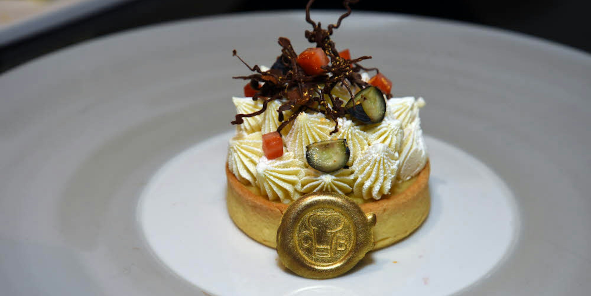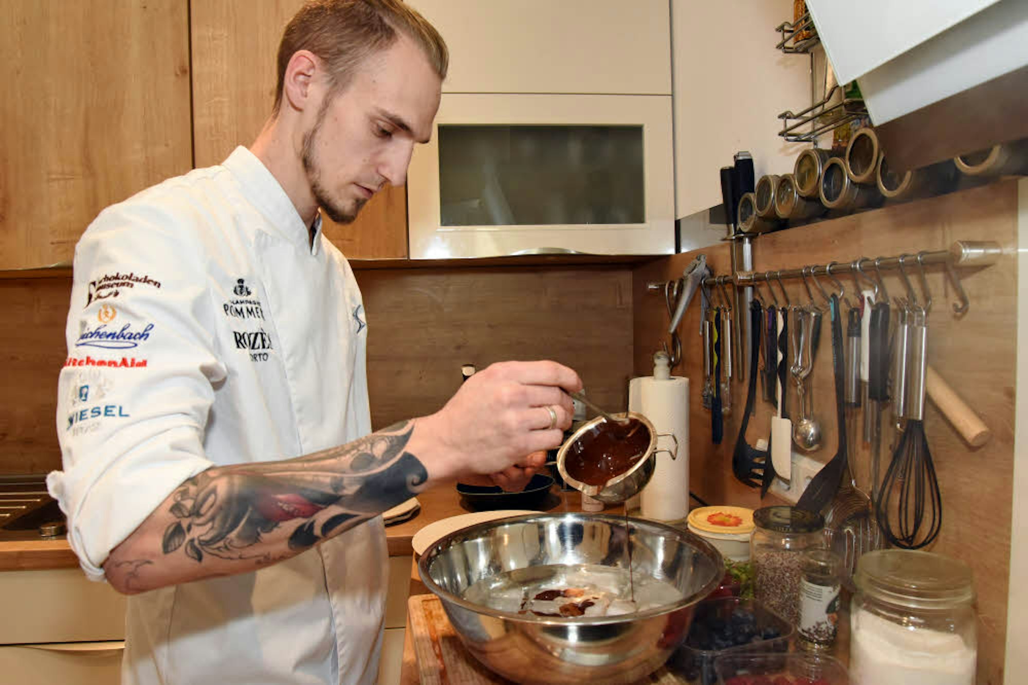 Dieringhausen/Windeck – Es ist ein wahres Kunstwerk, das Cyril Becker zu Hause in seiner Küche in Windeck auf den Teller zaubert. Konzentriert und mit ruhiger Hand verziert er ein Törtchen mit hauchdünnen Schokoladenästen und einem goldenen Schokoladensiegel, in das er seine Initialen eingraviert hat. „Das mach’ ich bei all meinen Desserts, das ist wie eine persönliche Unterschrift.“