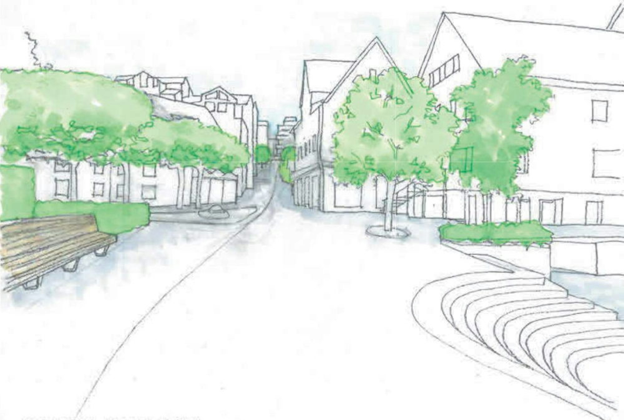 Weitere Änderungen am Siegerentwurf des Architektenwettbewerbs, der im Januar präsentiert wurde, betreffen den Asphalt vor dem Rathaus, zudem gibt es nun eine Freitreppe zur Wiehl. Am meisten Diskussionsbedarf hatte sich aber zwischenzeitlich wegen der Bäume ergeben.