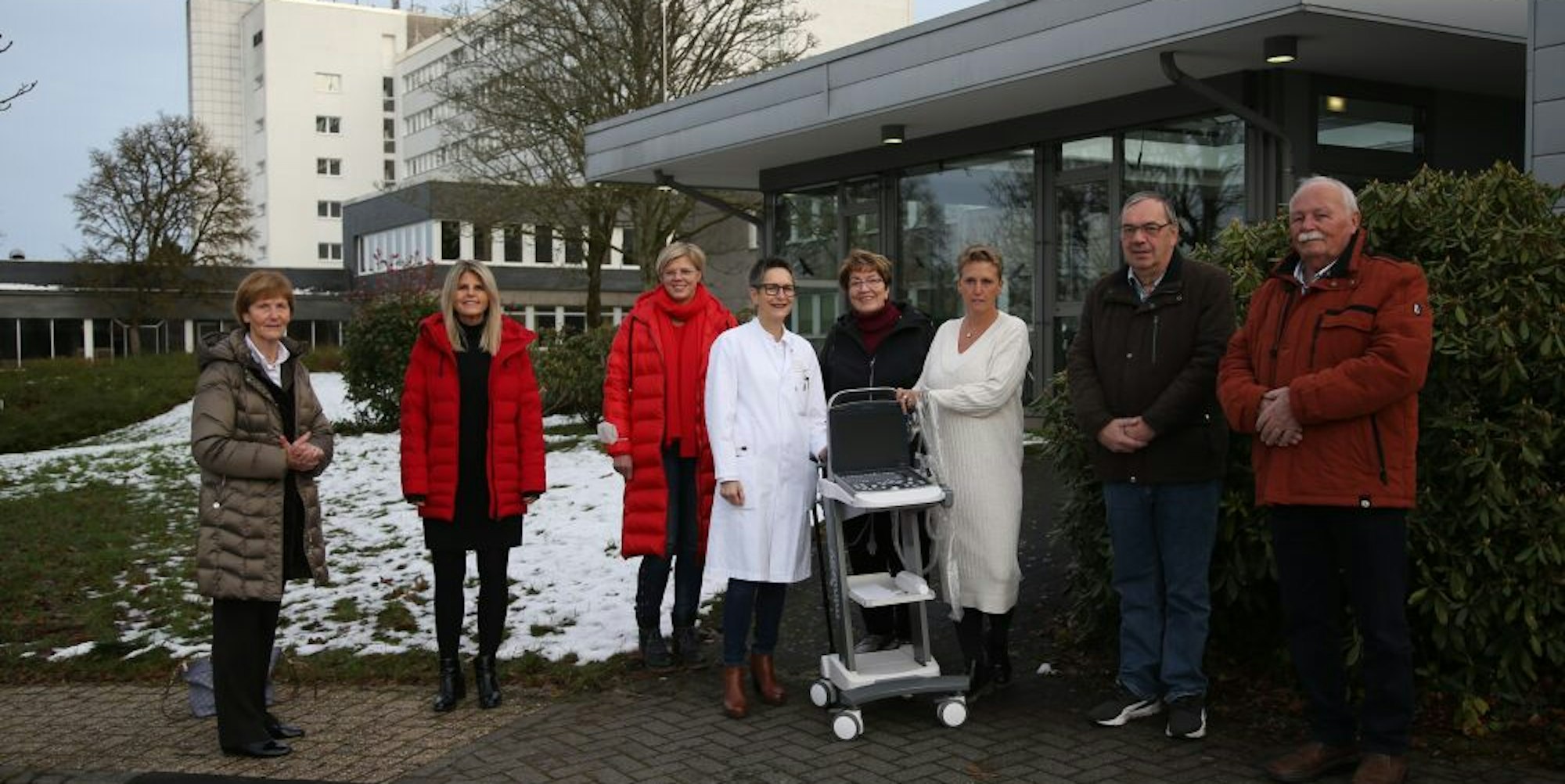 Die Vorsitzenden Monika Höfer und Sabine Tillmann (beide links) sowie der Vorstand freuen sich mit Chefärztin Dr. Ute Becker (4.v.l.) und Stationsleiterin Nicole Schrade (3.v.r.) über die neue Technik.