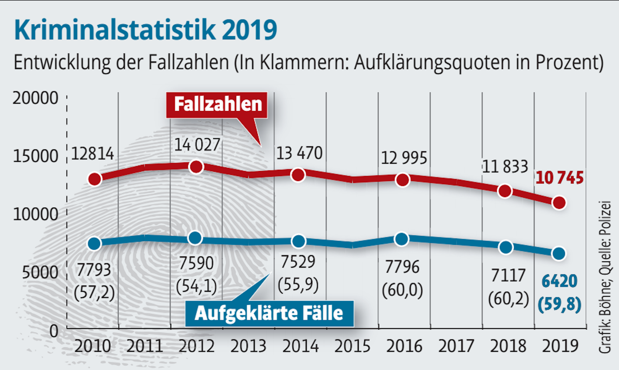 1366 Tatverdächtige waren letztes Jahr Kinder – 463 mehr als 2018. 4551 waren Jugendliche (plus 397), 4308 waren Heranwachsende (minus 657), 1722 waren Erwachsene (minus 137). Kinder und Jugendliche, so lautete der Erklärungsansatz von Mohr, seien heute weiter entwickelt als früher und somit auch früher so weit, Straftaten zu begehen. Dafür seien Heranwachsende eher reif genug, keine Straftaten mehr zu begehen.