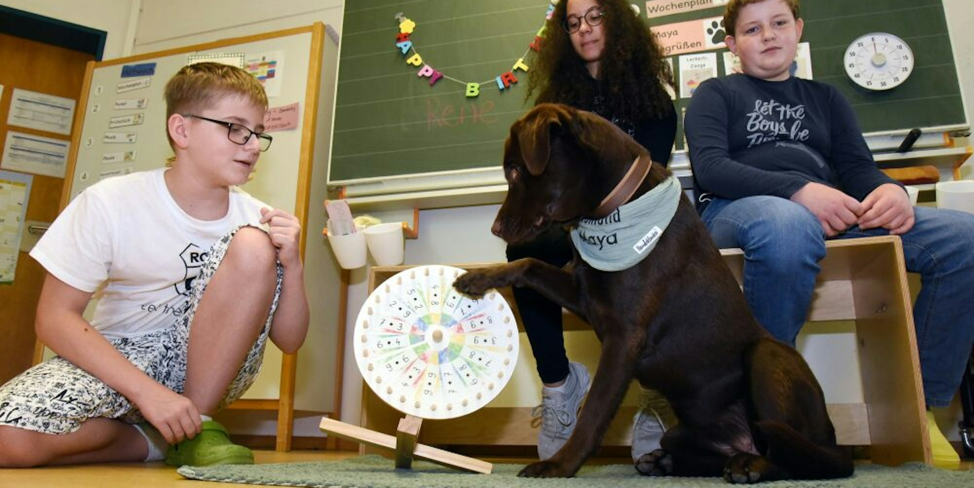 Zur Höchstform läuft Maya vor allem auf, wenn Mathematik auf dem Stundenplan steht. Mit einem kräftigen Pfotenschlag dreht sie dann das „Einmaleins-Glücksrad“, das das Kopfrechnen trainiert. Oder sie verteilt Zettel, auf die Bähr sechsstellige Zahlen schreibt, die ihre Schützlinge vorlesen. Am liebsten hat sie allerdings den Henkel eines kleinen Korbes im Maul, um damit die Aufgabenhefte einzusammeln.