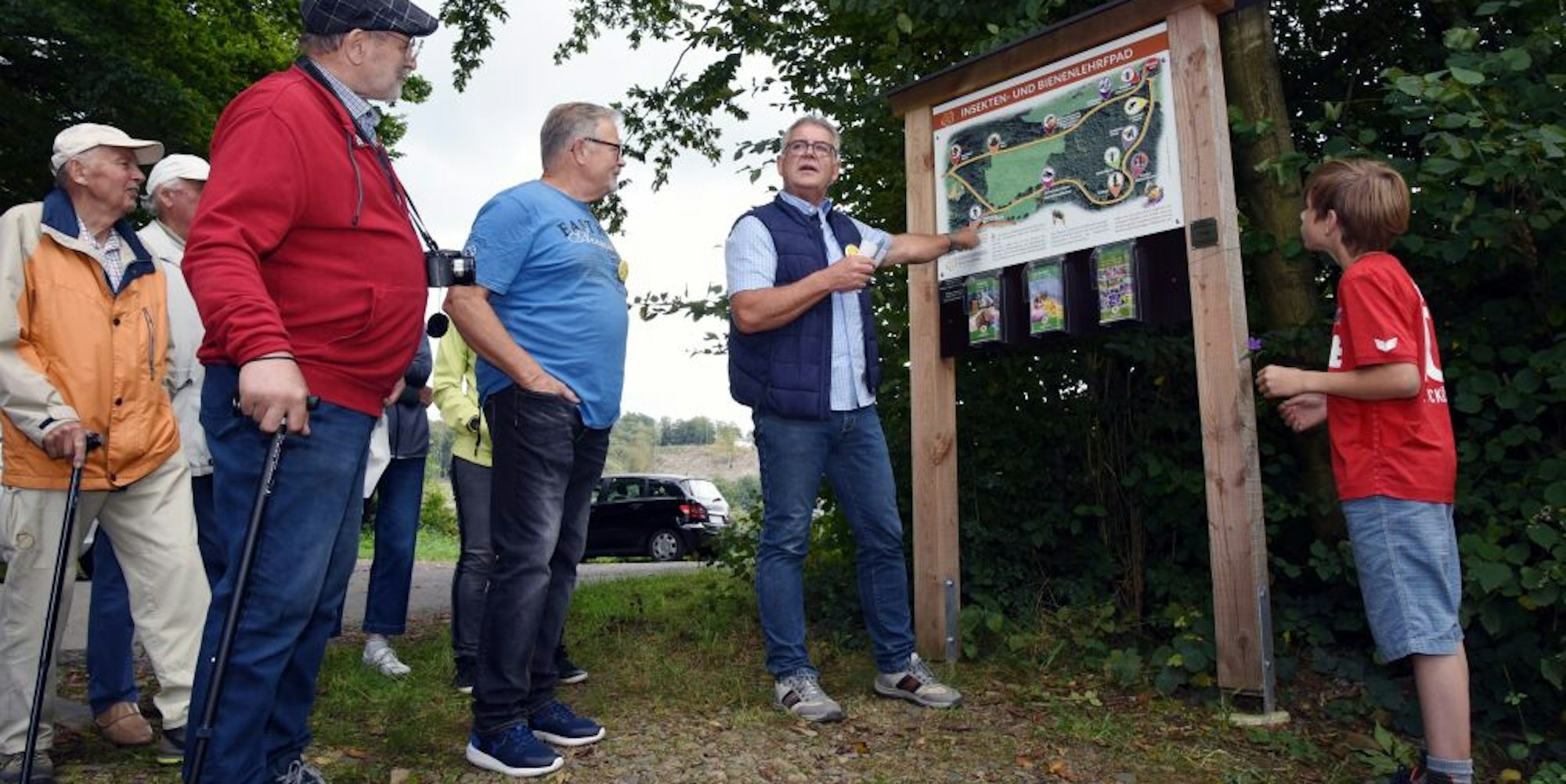 Unter anderem der Bienenzuchtverein Engelskirchen um Johannes Schuster (M.) hat Infotafeln zur Bedeutung der Bienen für die Natur sowie Insektenhotels und Bienenhäuser aufgestellt.