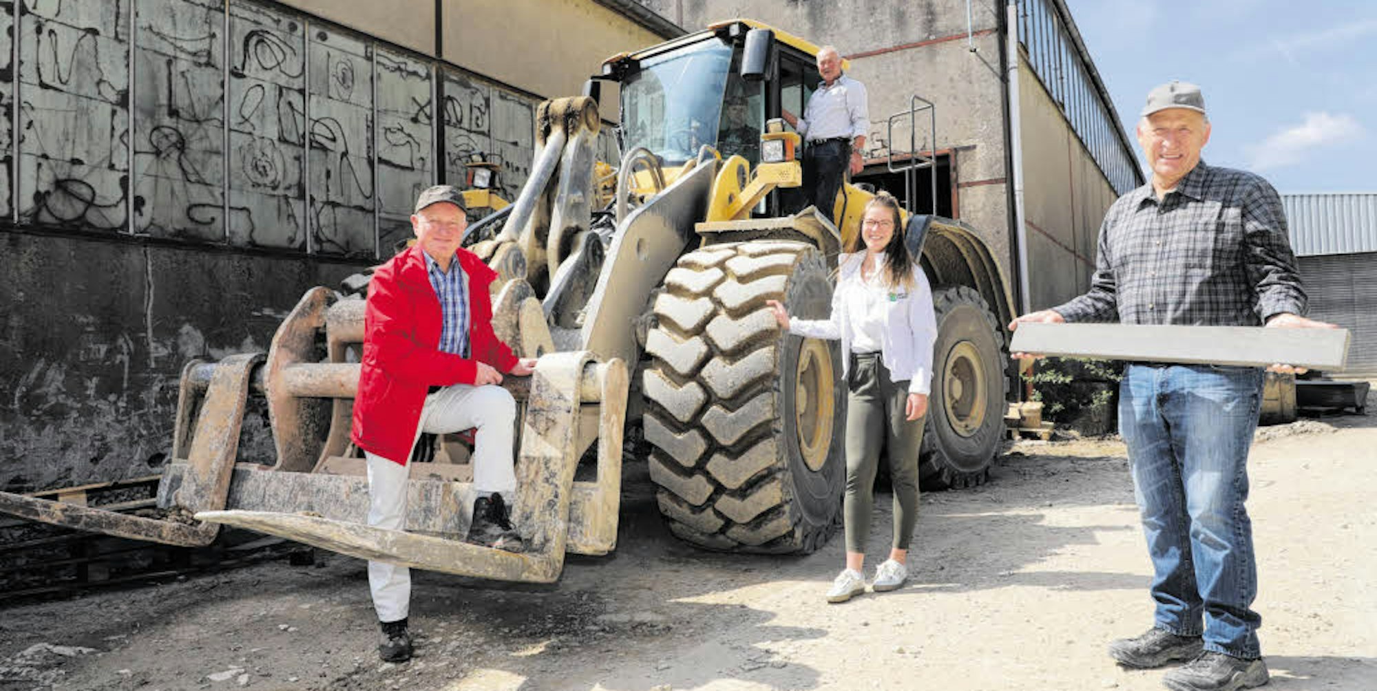 Am 32-Tonnen-Knickradlader: Stefan Blumberg (r.) und Winfried Panske (l.) geben den Teilnehmern beim Leserwandertag am 19. Mai Einblicke in den BGS-Steinbruch von Walter Lob (oben). Carolina Bolling von LindlarTouristik bereitet die Aktion mit vor.