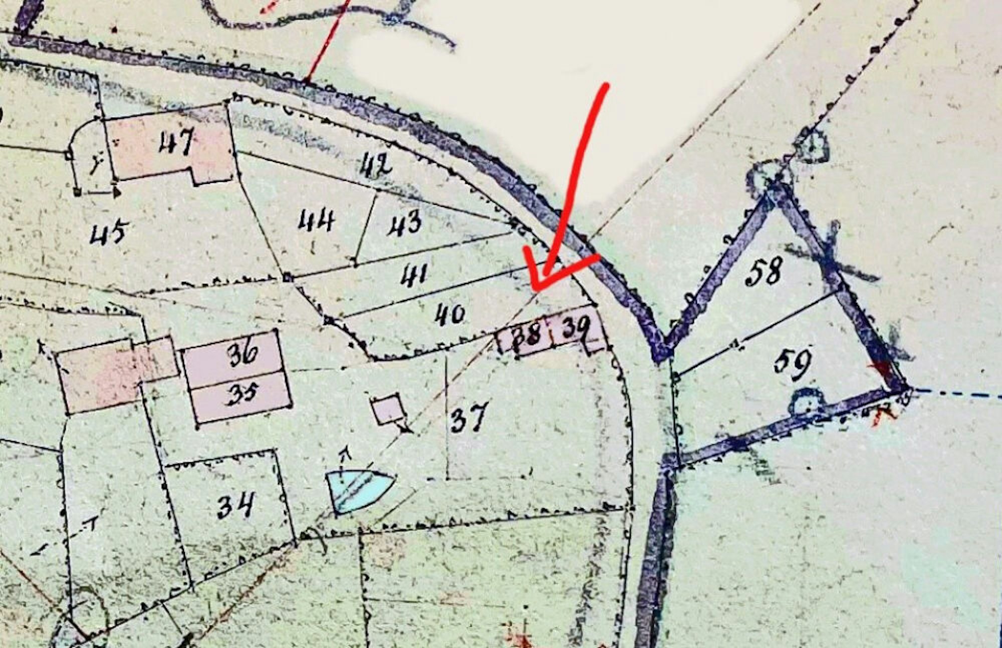Ein Auszug aus dem Urkataster von 1828, der Pfeil zeigt auf das winzige Doppelhaus Nr. 38/39.