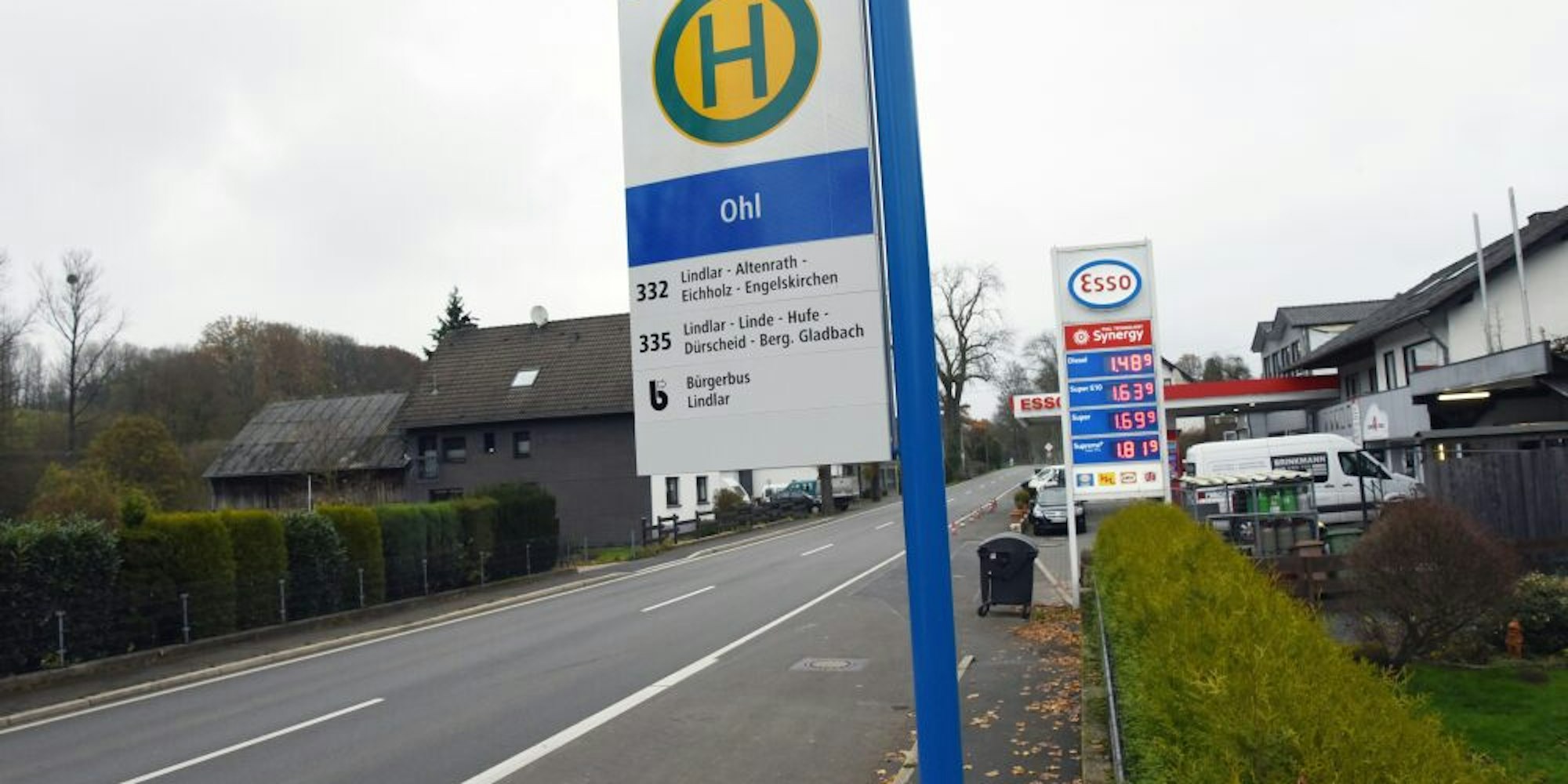 An der L 284 in Fahrtrichtung Wipperfürth – das Busschild am rechten Fahrbahnrand weist jedoch in Richtung Lindlar.