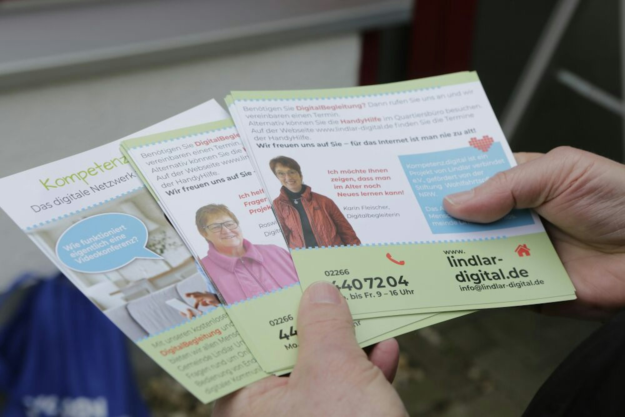 Flyer, auf denen sich Lindlars Digitalbegleitende vorstellen, liegen ab dieser Woche an vielen Orten der Gemeinde aus.