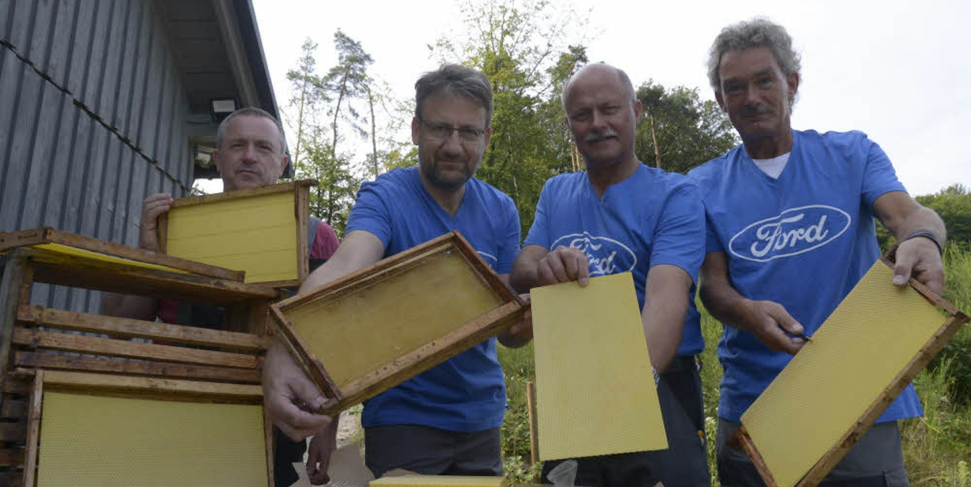 Bei der Reparatur und Herstellung der Bienenstöcke helfen die Ford-Mitarbeiter Franz-Josef Meyer, Bernd Delling, Peter Kurbel und Museums-Imker Josef Schmitz (v.r.).