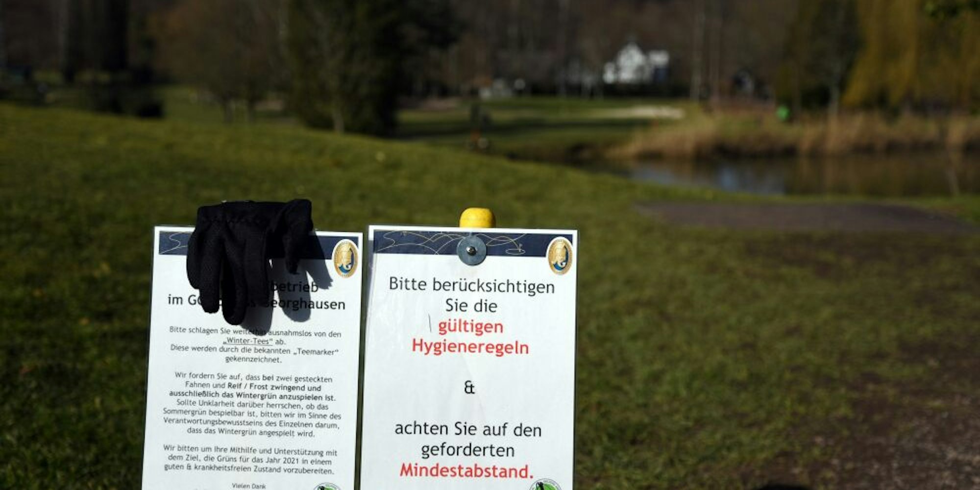 Auf dem Golfclub Schloss Georghausen darf wieder gespielt werden. Auf Hygieneregeln wird mit Schildern hingewiesen.
