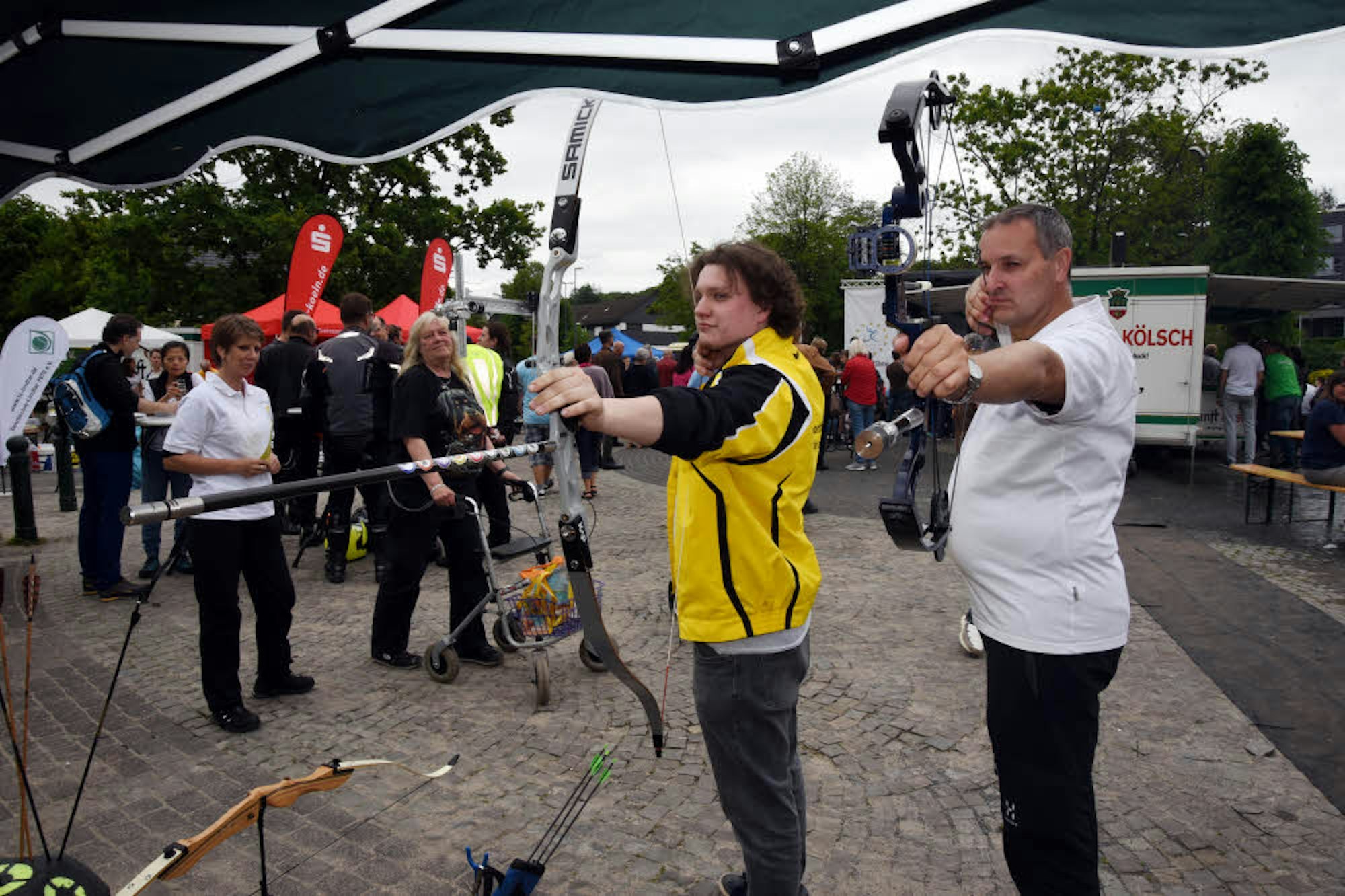 Auch die Bogensportfreunde Lindlar nutzen die Plattform um sich zu präsentieren. Bogen verschiedener Formen, Farben und Größen liegen vor und neben dem Stand. Auch Zielscheiben hängen am Zelt. „Schießen lassen können wir hier leider aus Platzgründen nicht“, erklärt Karsten Walter. Er schießt schon seit acht Jahren mehrmals wöchentlich im Verein. „Besonders Spaß macht mir, dass ich mich immer wieder selbst übertrumpfen kann“, meint Walter.