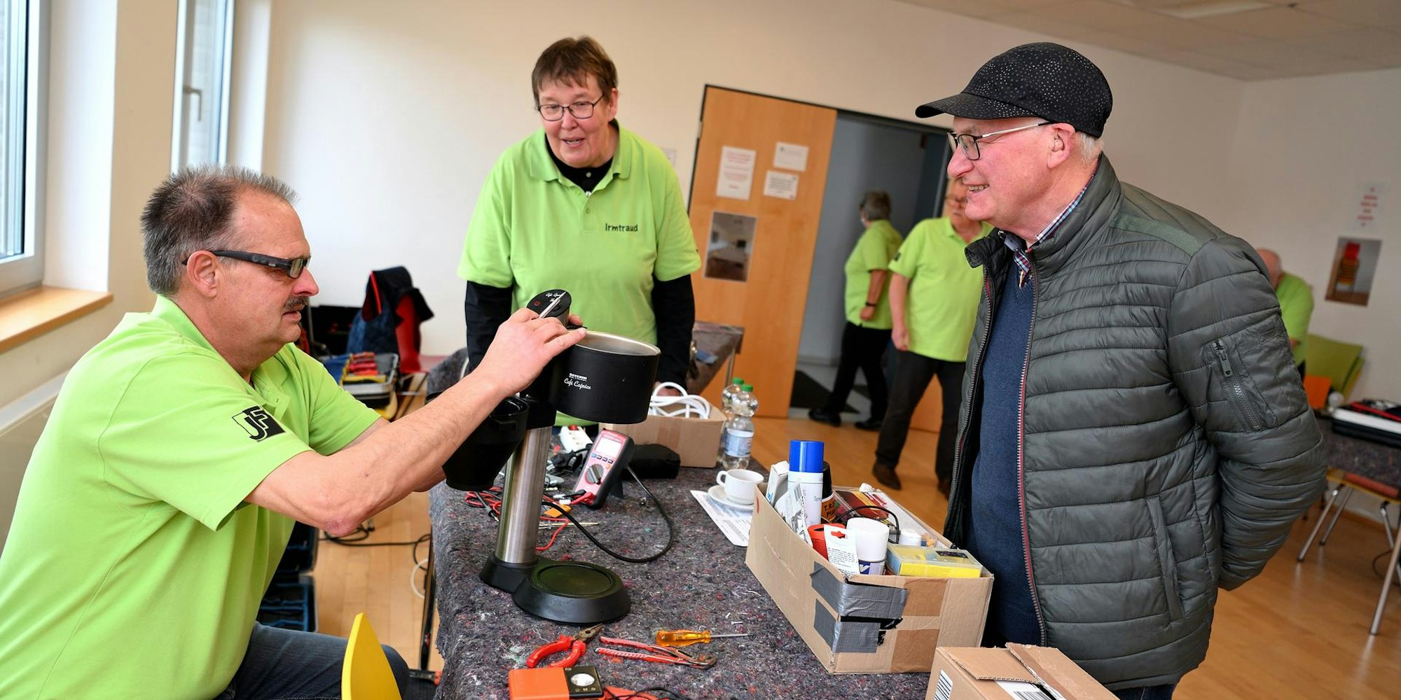 Den Fehler bei der defekten Kaffeemaschine von Gerd Rixen hat Hans Wierz (l.) schnell gefunden. Imtraut Bördgen schaut zu.