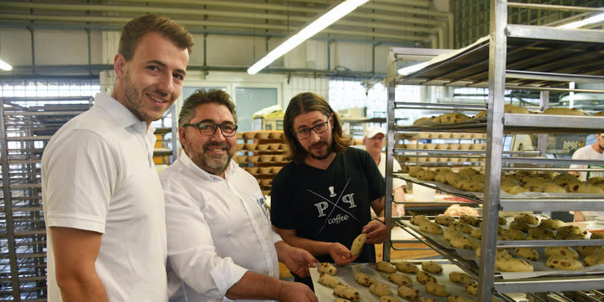 In dritter und vierter Generation backen Hanno Kraus und seine Söhne Fabian (l.) und Raphael Rosinenbrötchen.