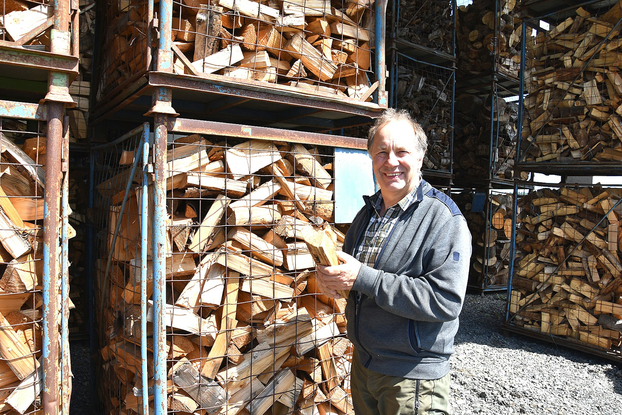Auf den ersten Blick sieht es auf dem Gelände des Familienbetriebs Roba in Griemeringhausen nicht aus, als sei das Holz knapp. Da türmen sich in der luftigen Halle doch mehr als 500 prallgefüllte Gitterboxen: Laubmischholz, das noch nicht trocken ist und erst einen Winter später in Flammen aufgehen soll, und Fichten-Käferholz, alles aus der Umgebung. Die große Verarbeitungsstraße zum Sägen und Spalten ist in Betrieb. „Die Hälfte der Boxen ist allerdings bereits vorbestellt“, erklärt Philipp Rosenbauer, der ebenfalls im Betrieb mitarbeitet. „Die Leute versuchen zu hamstern“, seufzt sein Bruder. „Da muss man diplomatisch sein und um Geduld bis zur nächsten Bestellung bitten, wenn ein Kunde schon eine Woche nach der Lieferung wieder anfragt.“