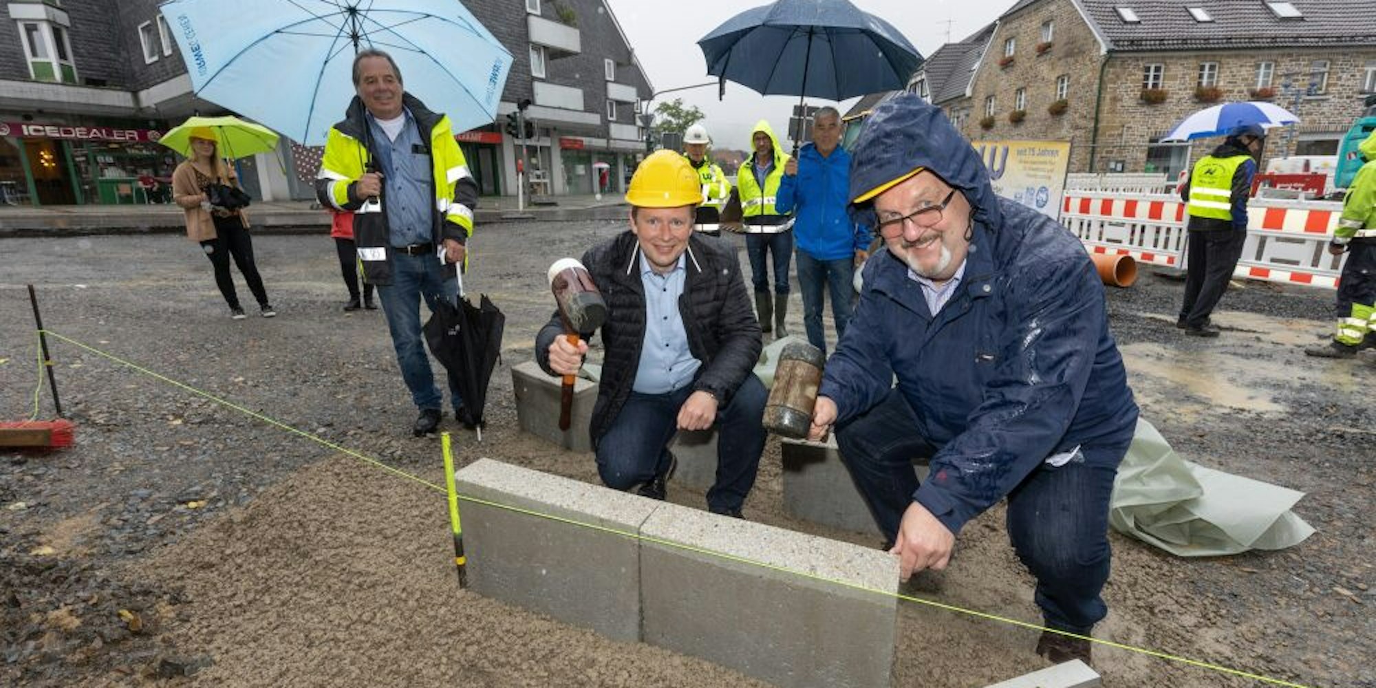 Marienheide – Die Hauptstraße in Marienheide ist seit gut eineinhalb Monaten aufgerissen, Bagger haben auf einer Seite einen neuen Kanal gelegt. Jetzt geht es gleichsam an den Feinausbau, und für den hat Bürgermeister Stefan Meisenberg am Mittwoch selbst zu Wasserwaage und Hammer gegriffen. Gemeinsam mit Thomas Raithel, Niederlassungsleiter von Straßen NRW Rhein-Berg, setzte er die ersten Bordsteine für den Kreisverkehrsplatz, der an Stelle der früheren Ampelkreuzung nun Form annehmen soll.