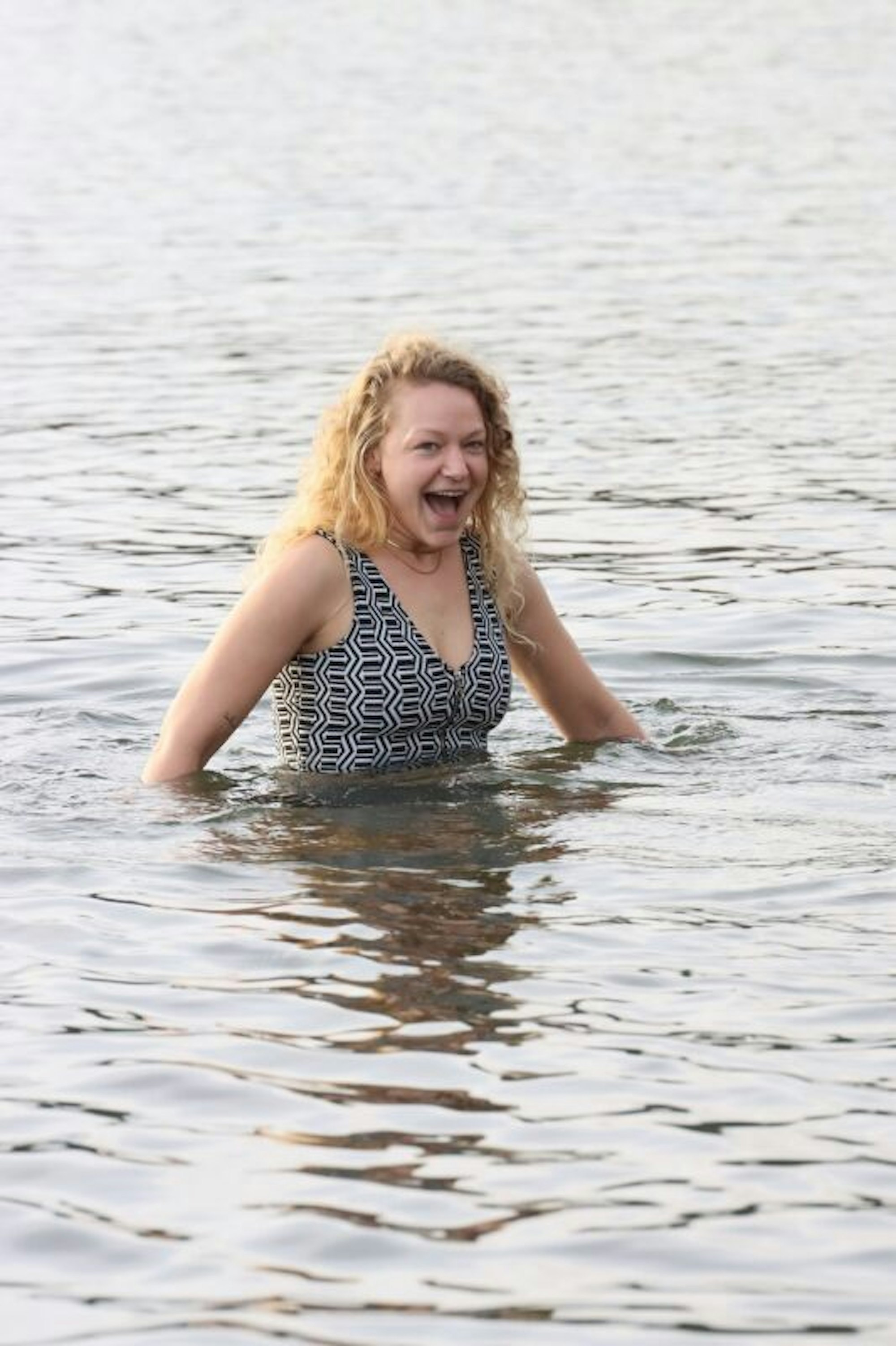 Neu in der Runde ist Kim Heitmann aus Amsterdam. Sie ist über Weihnachten bei ihren Eltern in Marienheide und ihre Mutter hatte sie gefragt, ob sie sich nicht das Neujahrsschwimmen anschauen sollen: „Kommt nicht in Frage – da mache ich gleich mit“, meinte Heitmann. Krystian Mącznik erklärt ihr, wie sie sich am besten vorbereitet: Erst ein paar Aufwärmübungen, ohne ins Schwitzen zu kommen, danach ein paar schnelle Atemzüge und dann hinein ins Wasser. „Das hat sich angefühlt wie 1000 Nadeln“, schildert die 32-Jährige hinterher. „Anfangs war es schwierig, ruhig zu bleiben. Aber ich mache auch Yoga – da hat es bald ganz gut geklappt.“