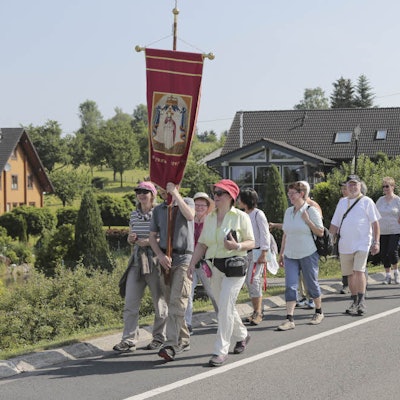Singend zieht die Gruppe mit der Wallfahrerfahne von 1984 in die Kirche ein, wo Andacht und Segen auf sie warten. Ralf Zeppenfeld trägt seit 18 Jahren die schwere Fahne durch Berg und Tal. „Einstellungssache“, sagt er dazu nur.