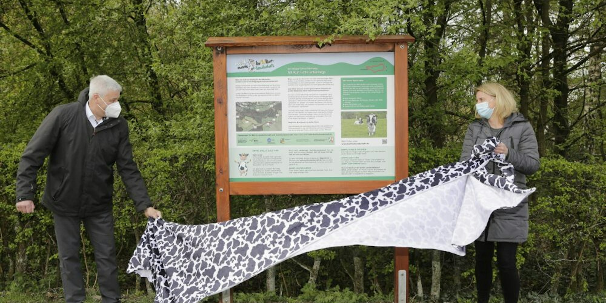 Auf den Tafeln gibt es jeweils einen Beitrag Kuh Lotte speziell für Kinder. Bürgermeisterin Loth und Hans Stöcker, Geschäftsführender Vorstand der Landesvereinigung der Milchwirtschaft NRW enthüllten die neue Starttafel an der Jugendherberge. Von dort führt der Milchweg vorbei an einem ehemaligen Milchkuhbetrieb in Stillinghausen und drei aktiven Betrieben in Lendringhausen. Über den Bahntrassenweg und durch den Wald geht es zurück zum Start.