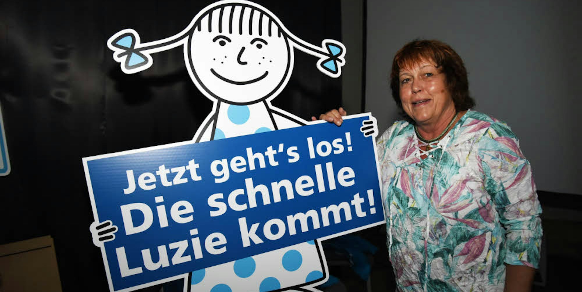Die GWN haben Geschäftsführerin Marion Wallérus, Nümbrecht bekommt „Luzie“, das Logo der Internetkampagne.